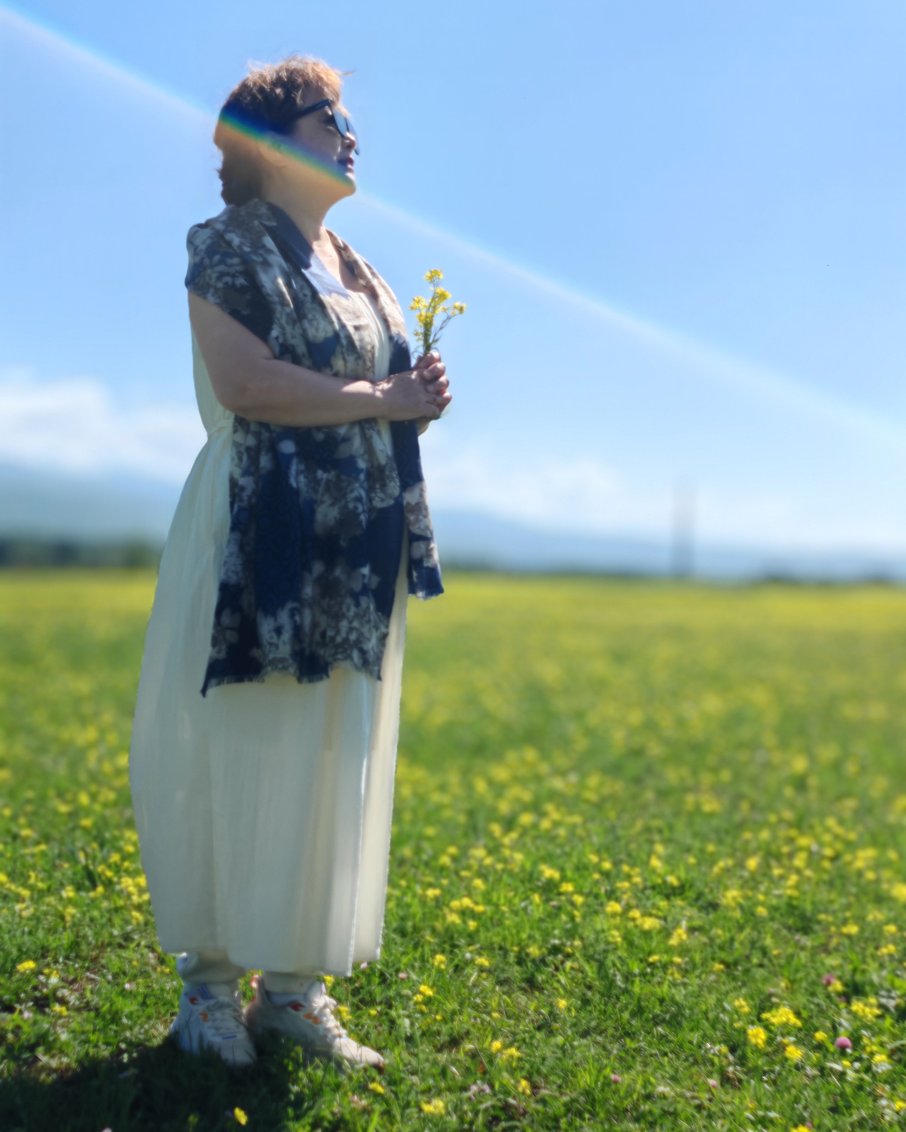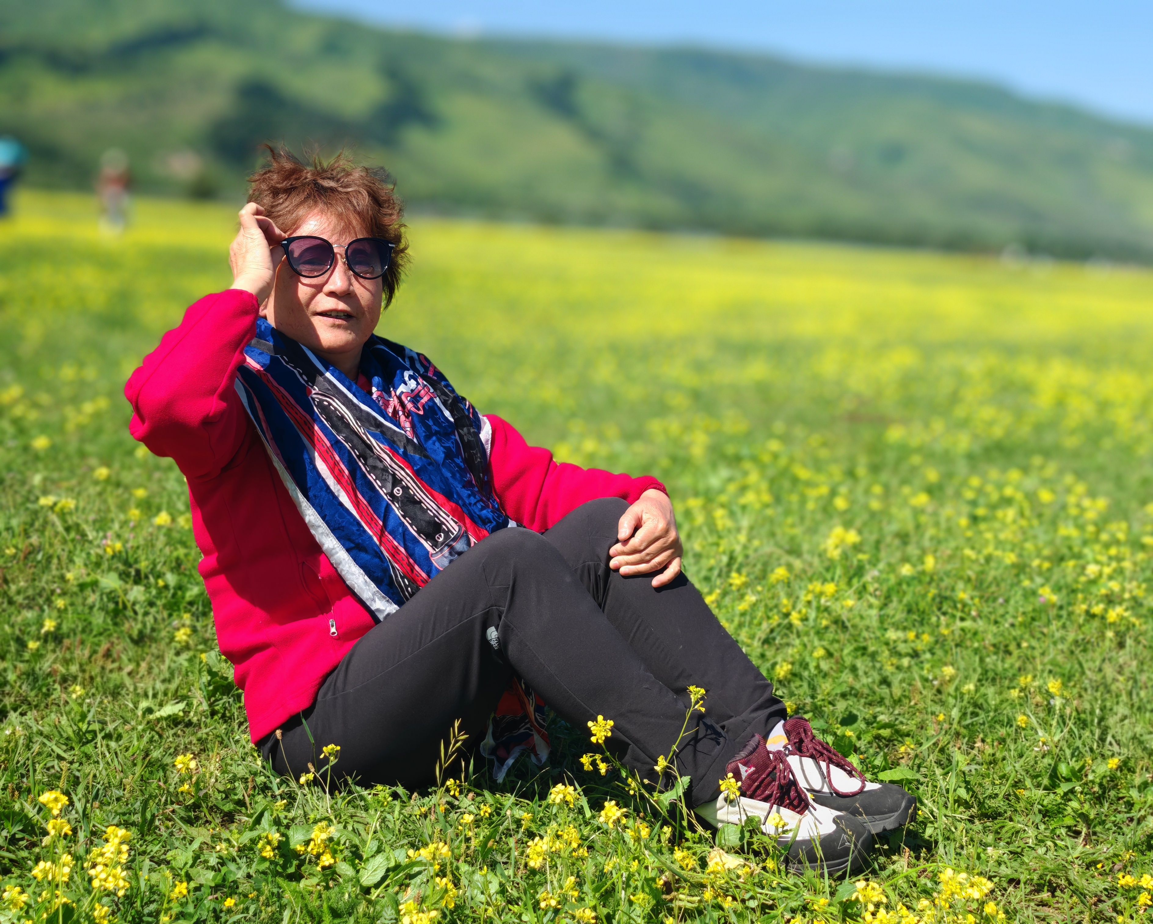 两个遛马的汉子走过来,用生硬的普通话问“骑不骑马?”为什么不呢?骑马漫步、花间嗅香、草地拍照、坐在椅子上欣赏白云远山,大家各得其所。目撷山间松色,身披彩虹衣装,我们不再是游览者,而是身心的体验者。你不信吗?你看,正有人举起相机对着我们拍照呢!在这里玩了1个多小时,然后到空中草原和游牧人家打卡拍照,下午4点多离开景区。