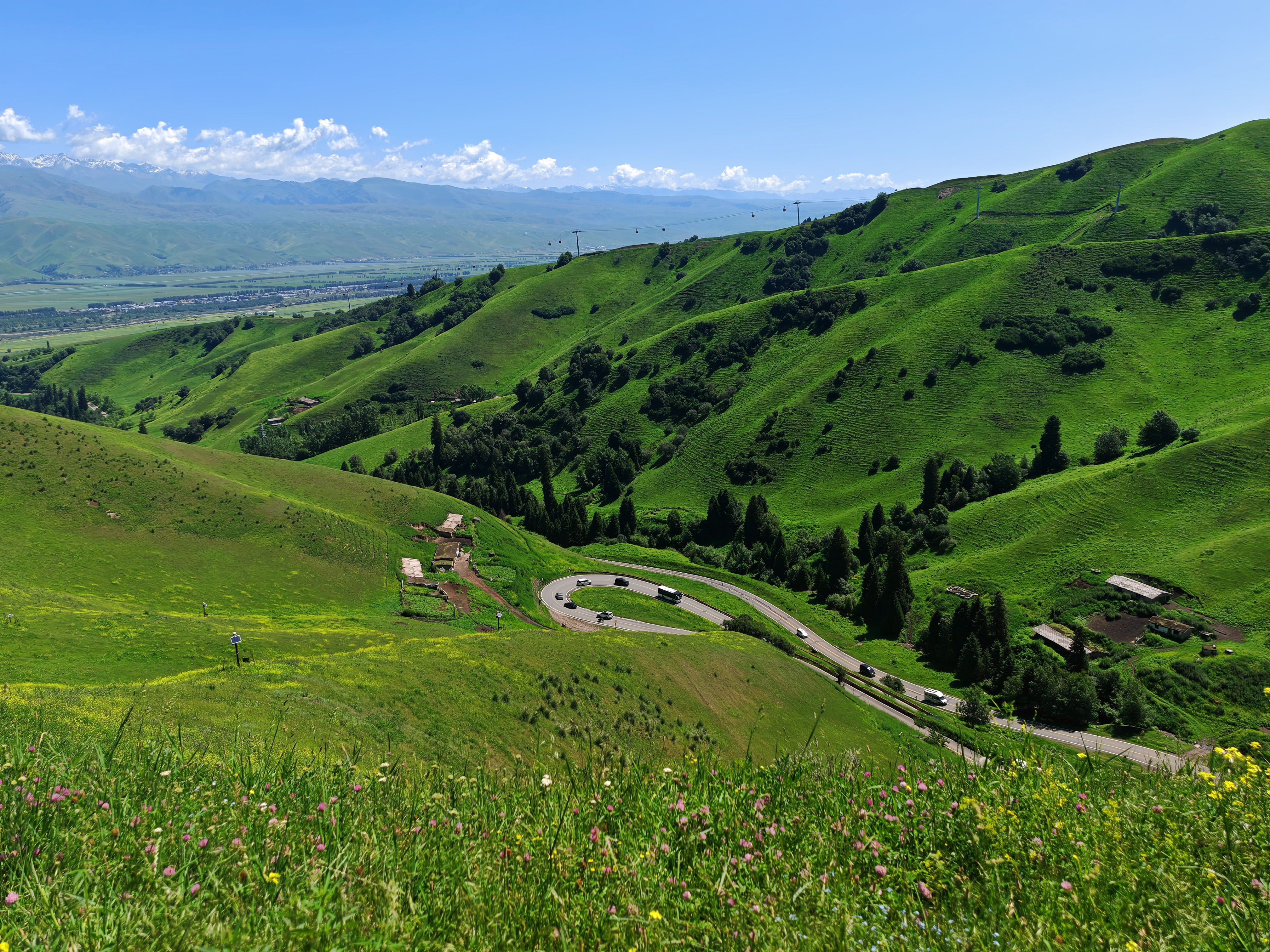 10点出发进那拉提景区。一片开满细碎小花的连绵不绝的牧场展现在眼前,伴着墨绿的山上森林,正是一笔浓墨一抹鲜亮,让牧场生动鲜活。无需再走,停车!拿下折叠座椅,摆上茶点、沏上绿茶、冲上袋装咖啡,我说说赛里木湖畔的星辰和霞光里的天鹅,他们说说伊利咯赞民俗村的五彩斑斓,霍尔果斯口岸的庄严。风景是眼的收获,风情是身的体会,风骨是心的共情。丛哥和老吴拿出无人机,在无比空旷的环境里放飞,来一个鹰的视角。那拉提清清浅浅盈盈欲滴的草,无边无垠像静静的海,逶迤的山峰层林尽染像波涛汹涌的浪,飘逸的云雾漂浮流动生机盎然。这美景鹰看得到不知道,过去的山水诗人想得到看不到,而今天的我们,看得到也知道不用想象,何其有幸啊!