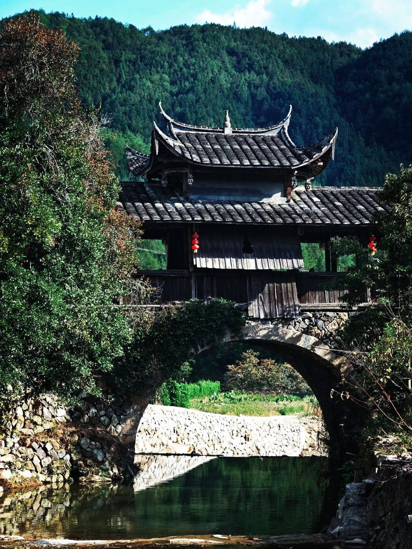 闽东最美古廊桥之一,榫卯结构横跨溪涧,周边有徒步路线,深入山林,秋季红叶掩映如画。