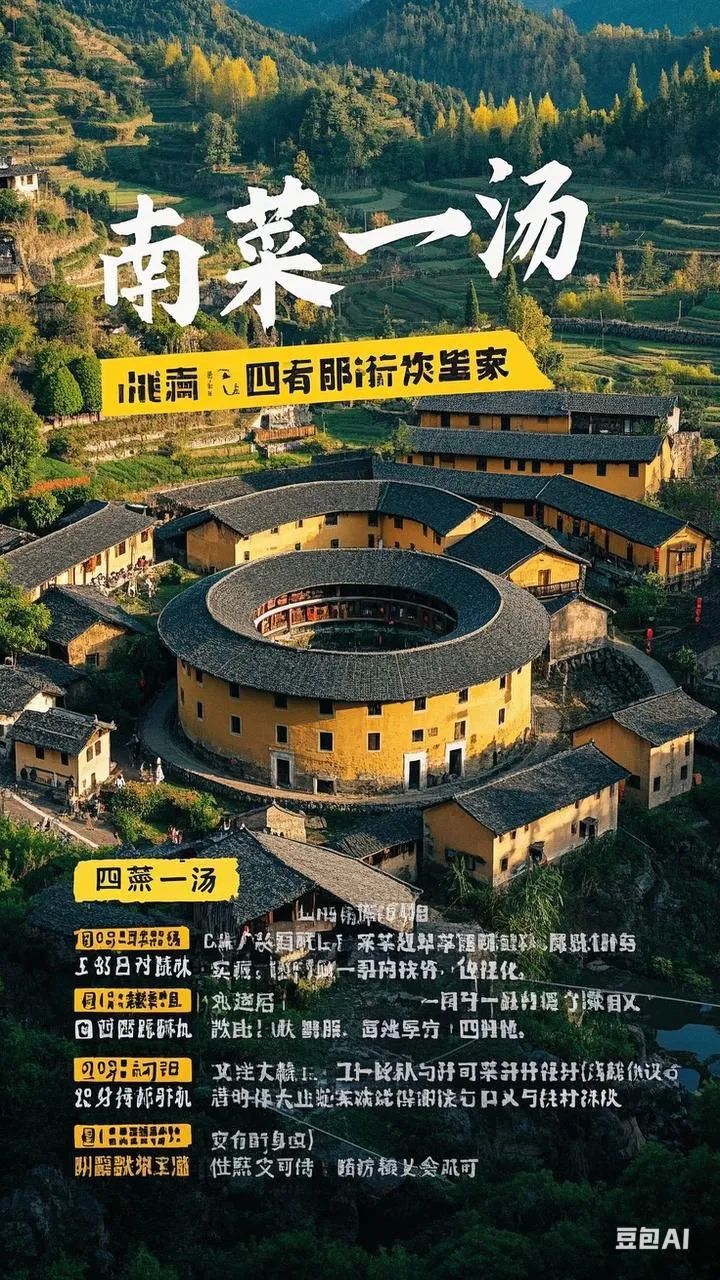 * **一日游:** 田螺坑土楼群(“四菜一汤”)裕昌楼(“东倒西歪楼”)塔下村