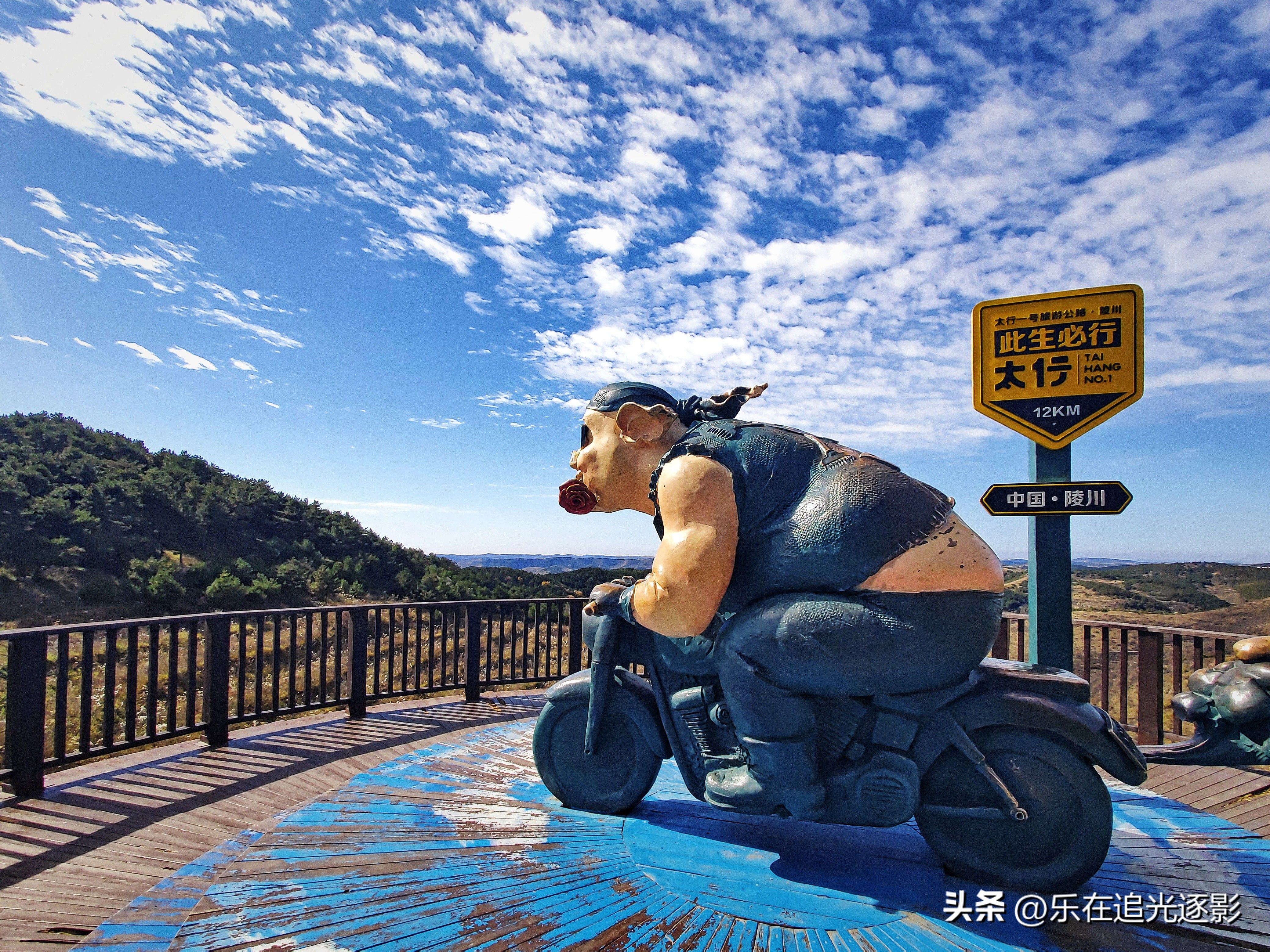 从凤凰古寨出来到棋子山观景台大约60公里,2个小时左右,到达这里已是中午,天清气朗。这里有一个很大的观景平台,有一栋服务楼,有不少卖东西的,可就是找不到卫生间。广场上两大标志,一是《山西·陵川·棋子山·国家森林公园》的石头雕塑标志,二是一尊猪八戒骑摩托车飞奔的雕塑。这两座雕塑打卡拍照的人很多。走到观景台两侧观望,这里虽号称太行山巅,但山势平缓,只是森林较多,与一路经过所见众多太行奇山秀水相比,难免有些失望。