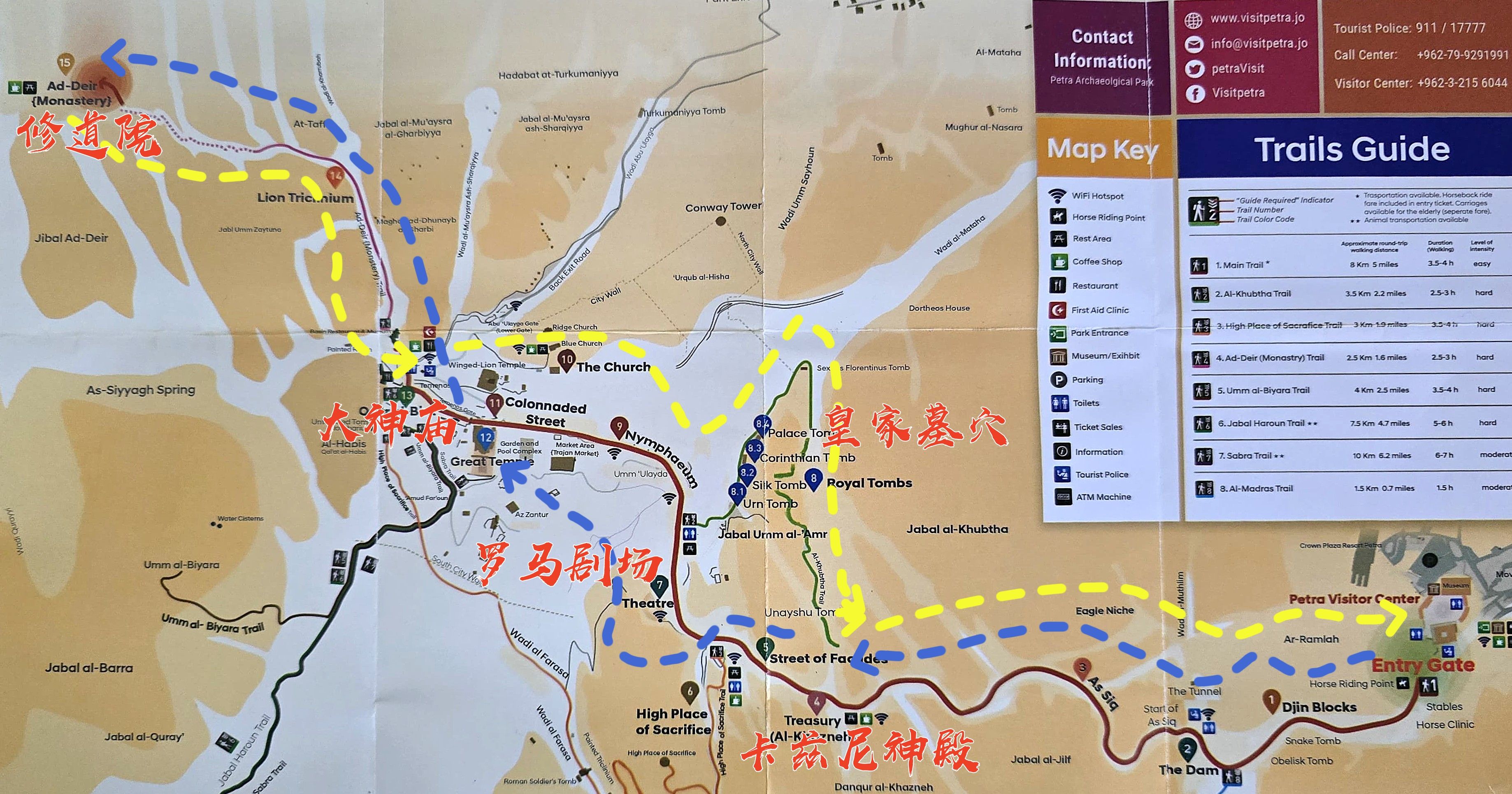 景区正门进去一直走到底,穿过蛇道、卡兹尼神殿拍照,然后是右手边山上的贵族陵墓群,左手边的罗马剧院、大神殿,最后登上最高点的修道院,然后原路返回。总步数干到了27000步,而且还有很多的爬山路段(路线看我最后一图)