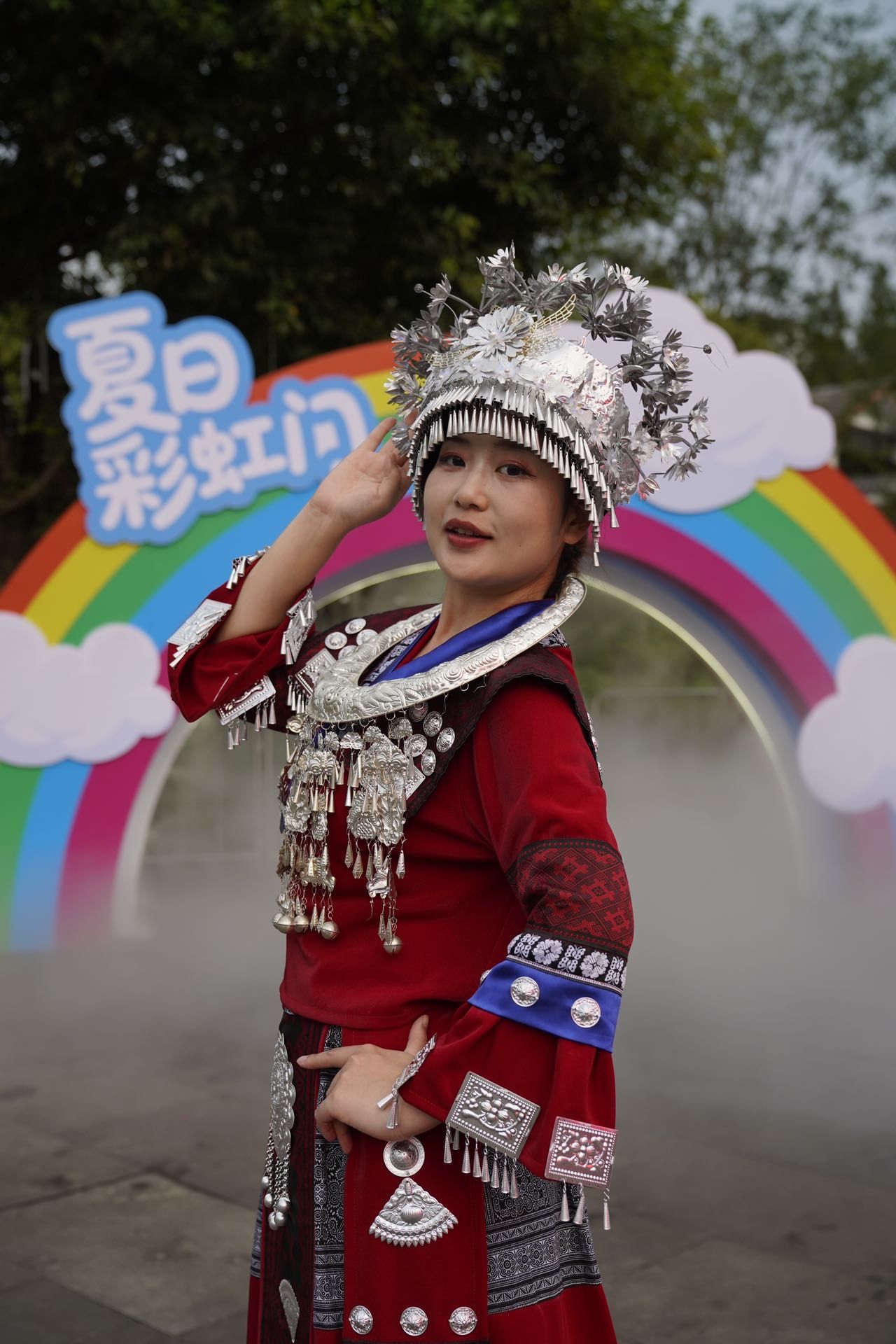 玩累了别跑,游客中心的蹦苗迪必须冲!苗家音乐混着电子节奏,领舞的小姐姐穿刺绣苗装,动作里全是踩堂舞的韵味,跟着晃肩扭腰就完事,旁边陌生人都能笑着一起蹦,快乐到停不下来。晚上电音节才是重头戏!营地舞台灯光一亮,DJ打碟带得全场沸腾,电音乐队和娇阿依歌舞秀轮番上阵,传统调子缠上电音鼓点越听越上头~带娃的不用担心,小小漂流家嘉年华有泡泡大战、竹筏DIY,孩子玩到不想走!