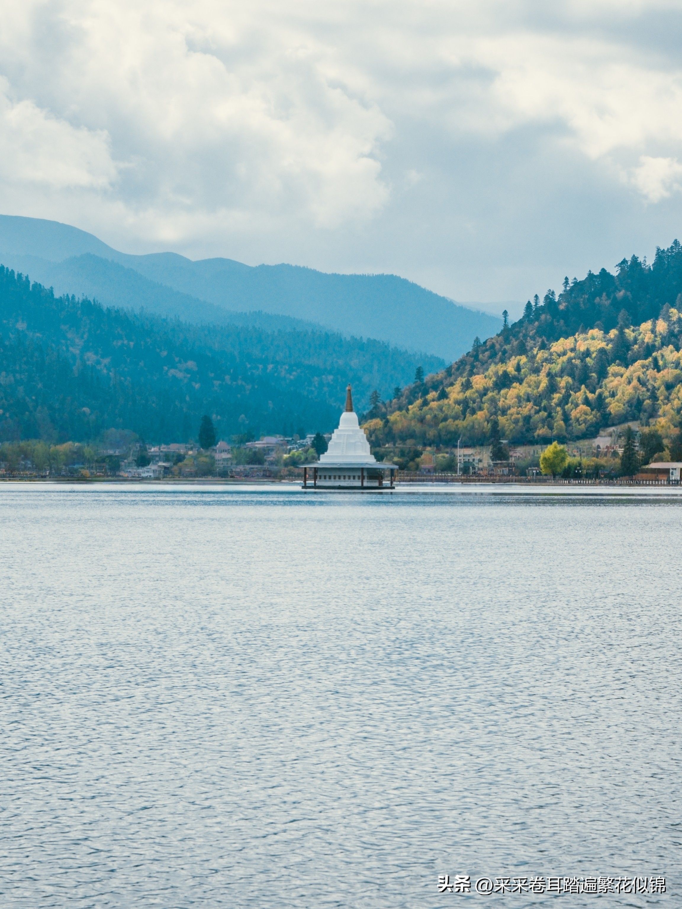 湖光潋滟的中心一座藏式白塔独自矗立。塔的背后左边青山如黛,右边层林尽染,一副自然与人文交织的工笔画卷就在眼前。