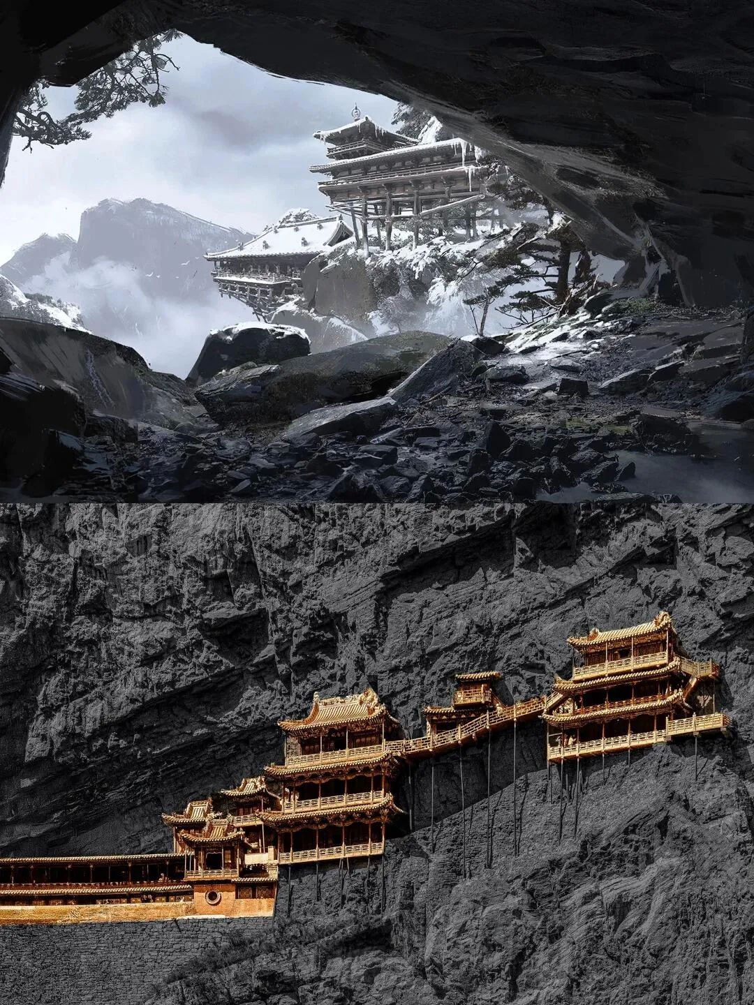 - 霞客亭用长焦拍摄全景,栈道二层以琉璃瓦为前景复刻《黑神话:悟空》构图。