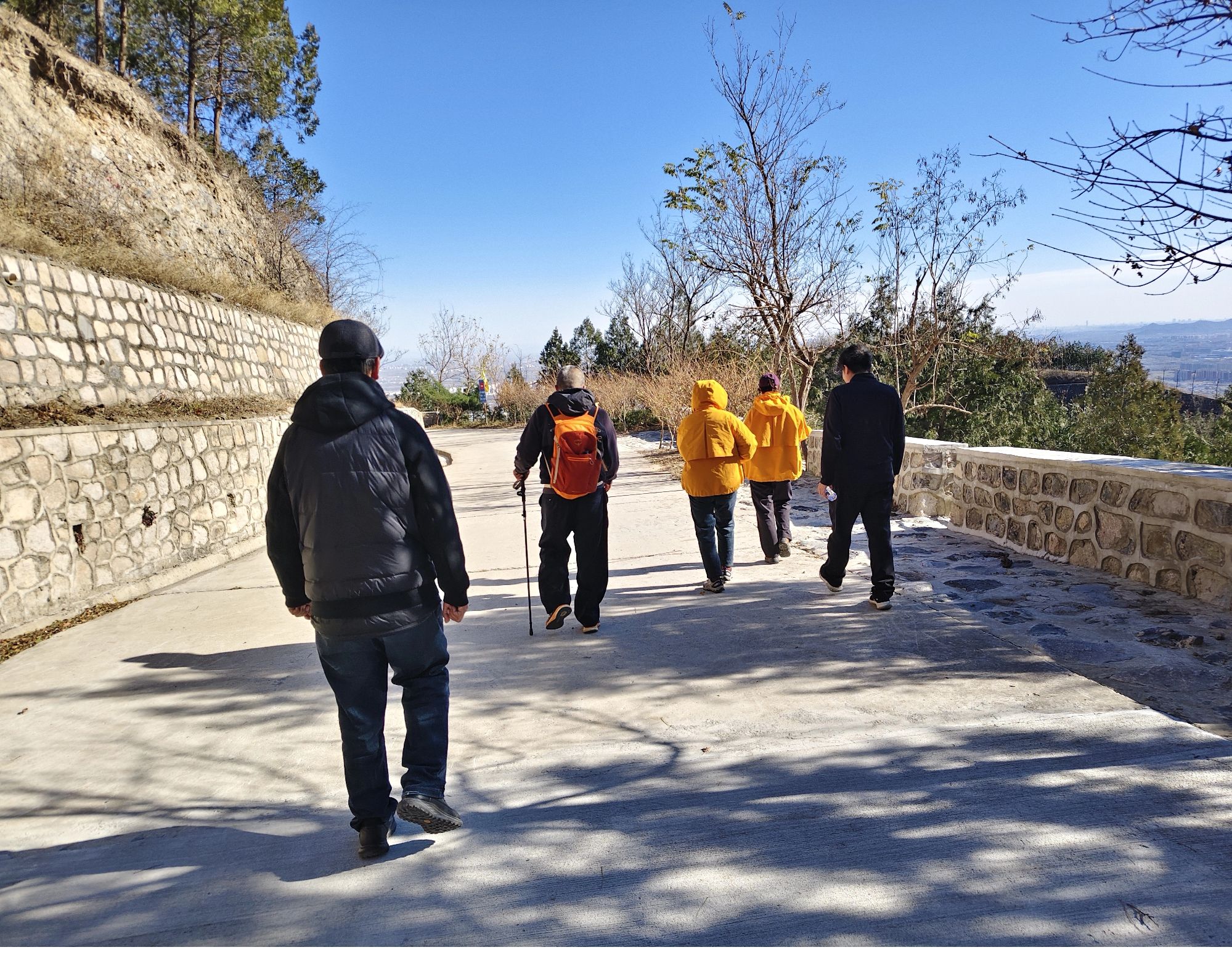 时值深秋,天气转凉,村里的游客寥寥无几,小山村更显静谧清幽。我们顺着平整的水泥路前行,走到一处十字路口右拐,便踏上了登山之路。山路不算陡峭,却因地形错落而颇具野趣,山间的风一路随行,越往高处越猛烈,吹得人发丝飞扬,竟有些站不稳脚。我们循着溪流的潺潺声向西而行,不久便抵达了磨镰石茶棚——这是老北道上的第一个茶棚,旧时庙会期间,这里是为往来香客提供饮食休憩的驿站,如今虽只剩遗址残垣,却仍能想见当年的热闹景象。