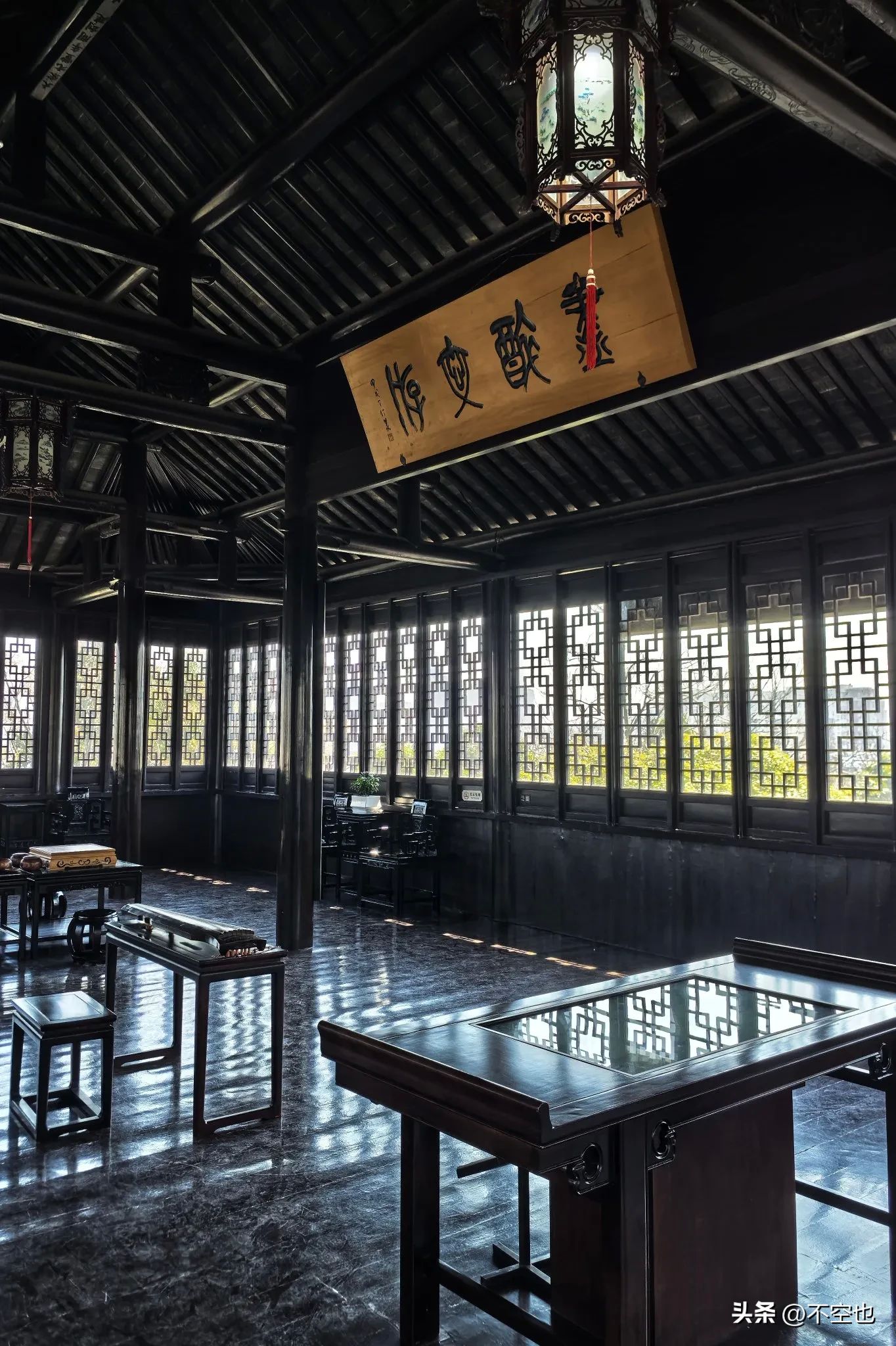 铜像的东侧是客集堂,西侧为秦观纪念馆。铜像背后,高耸的文游台似乎在默默地守护着这位高邮的历史名人。说是高台,其实也不过十多米,白墙灰瓦、褐色梁柱,门厅悬挂“淮堧名胜”匾额,内部瓷壁画《四贤聚会》及《西园雅集图》刻漆屏风,展现了宋代文人的风雅生活。