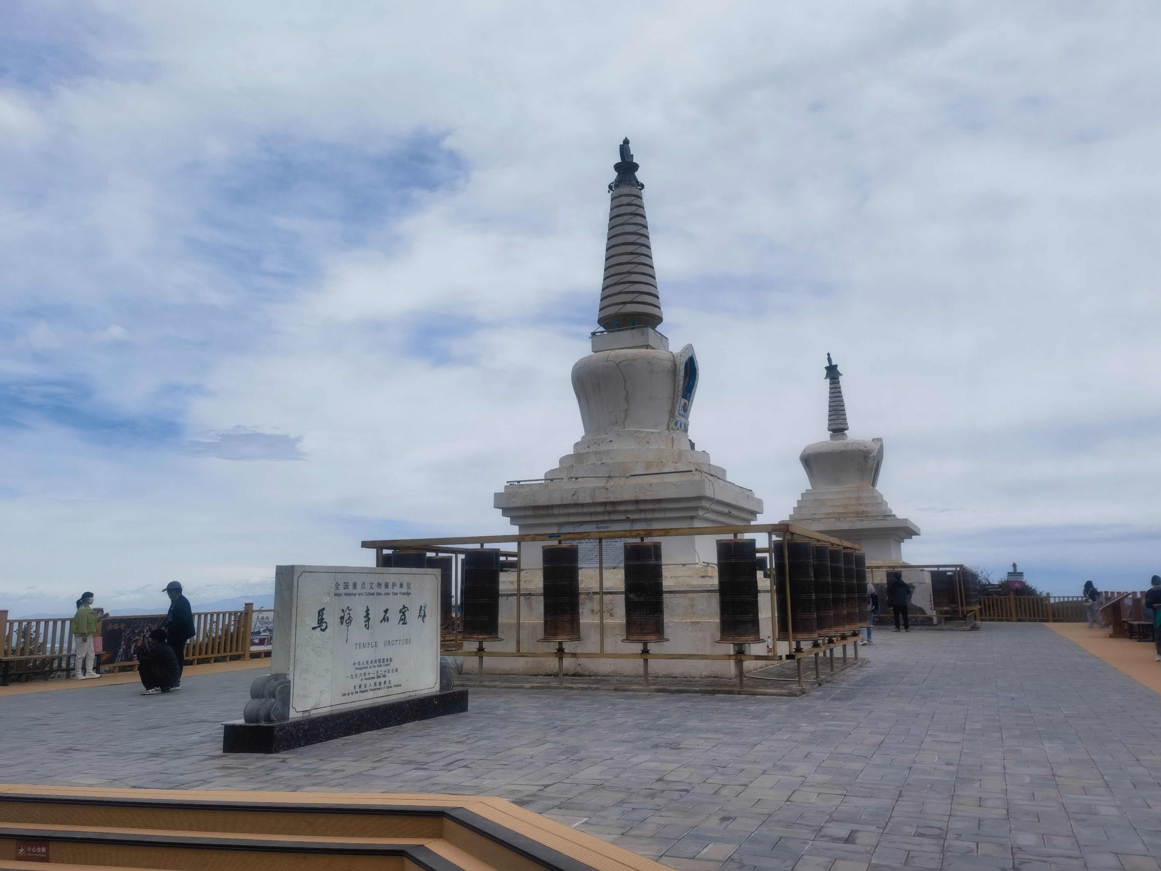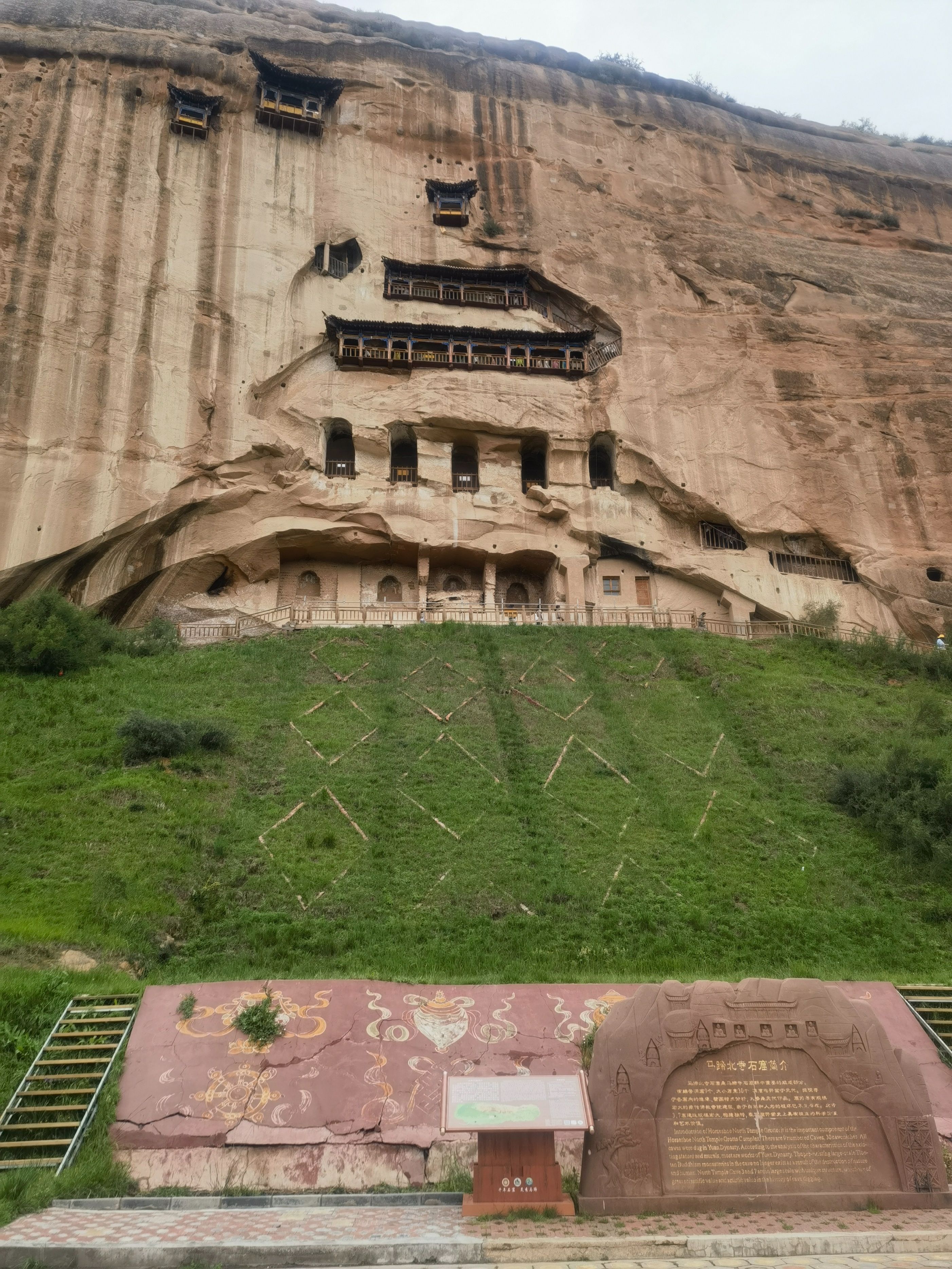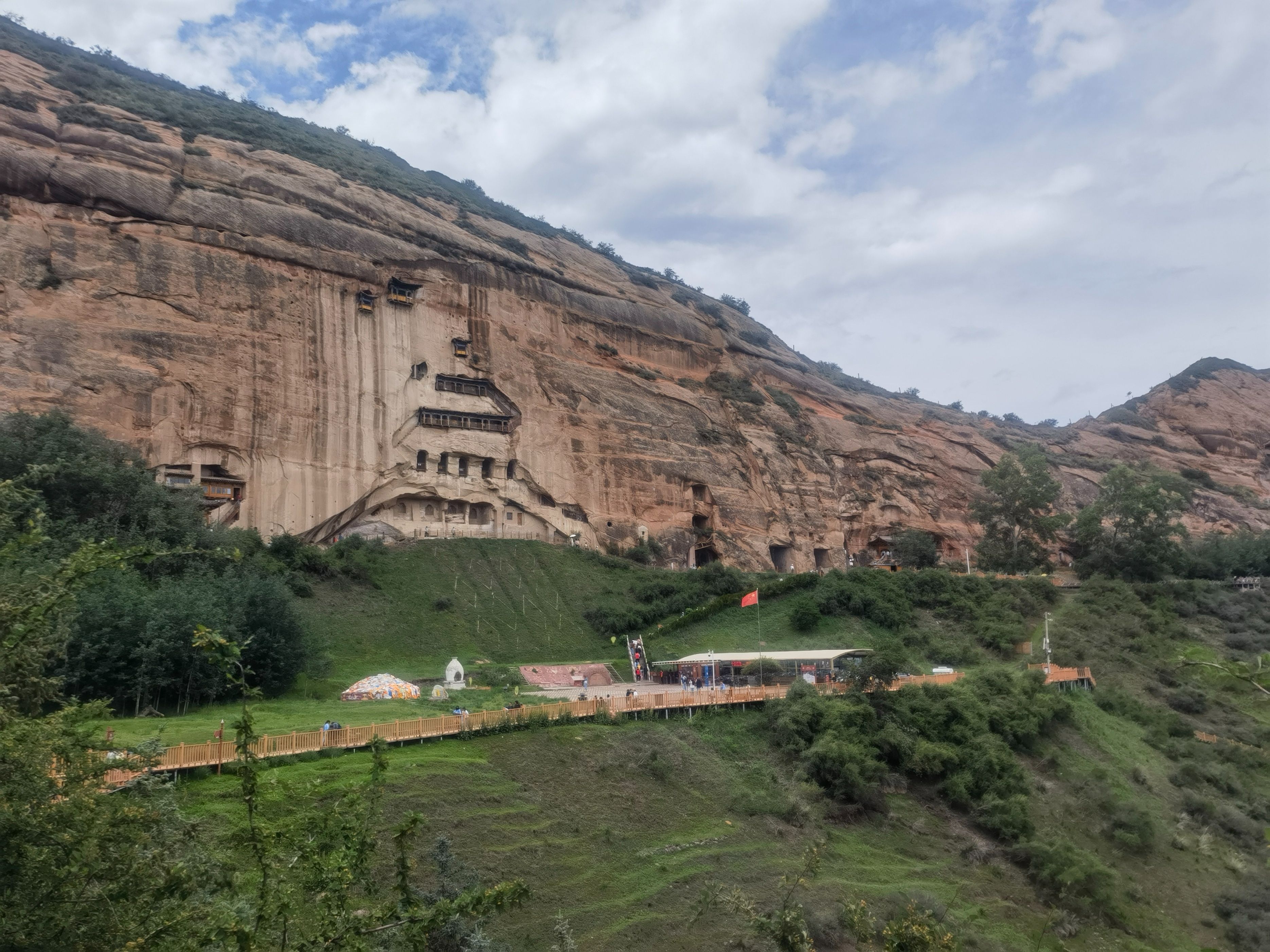 7月5日(周六,出行第二十七天),早晨天气凉爽,我们按计划上午前往民乐县,在县城边看到一“古塔”,停车走进寺庙,原来是“圣天寺”,寺庙正在修缮,没有游人,我们转了一圈儿就走了。当我们驾车走在林荫小道,偶然发现远处的高山隐隐的雪山,看到路边大片的油菜花时,很多人停车拍照,我们也停车加入欣赏美景的队伍,中午就来到了“马蹄寺景区”(国家4A景区,门票74元,60岁半价优惠),景区停车场很大,经过一段坡道,两侧都是商铺(纪念品、食品、小吃),就来到游客中心购票,进入景区大门乘坐观光车(往返13元)可去三个景点。下车走了800米看到了“马蹄寺石窟群″,一下子把我们“震撼”到了,来之前我们原以为只是一座藏传佛教的寺庙,没想到是精美的石窟,与山西“悬空寺”不同,先人们的智慧才智与能工巧匠打造而来,眼前看到一个绝壁上修建了几处寺庙,看到上边有人在走动,我也好奇地想上去一探究竟。我跟随着参观人流,一个一个的攀爬、钻洞,最为经典的是“三十三天石窟”,庙与庙之间是在山体里掏挖的梯子,有的直上直下,有的只能一人通过,虽然感觉有些“惊险刺激”,但更多地是内心里佩服这一奇迹般的“创举”,在路边还看到一只硕大的“土拨鼠”等待游人的喂食,我们乘坐观光车继续游览千佛寺、格萨尔王殿等两个景点,然后乘坐观光车返回停车场就离开景区了。几天下来,脑海里还时常回荡着攀爬“三十三天石窟”场景。隆重建议只要来张掖的朋友,千万不要错过“马蹄寺”。