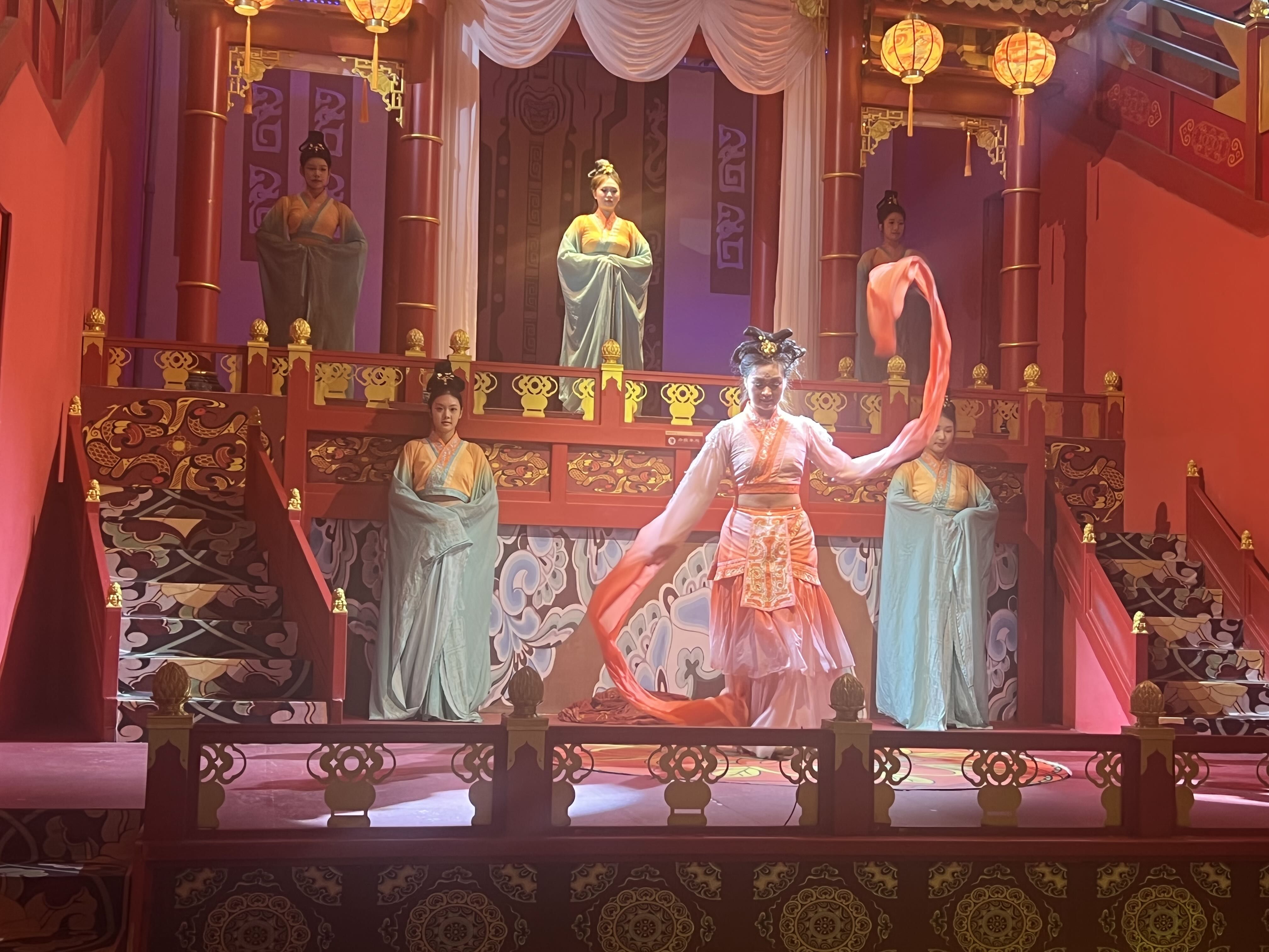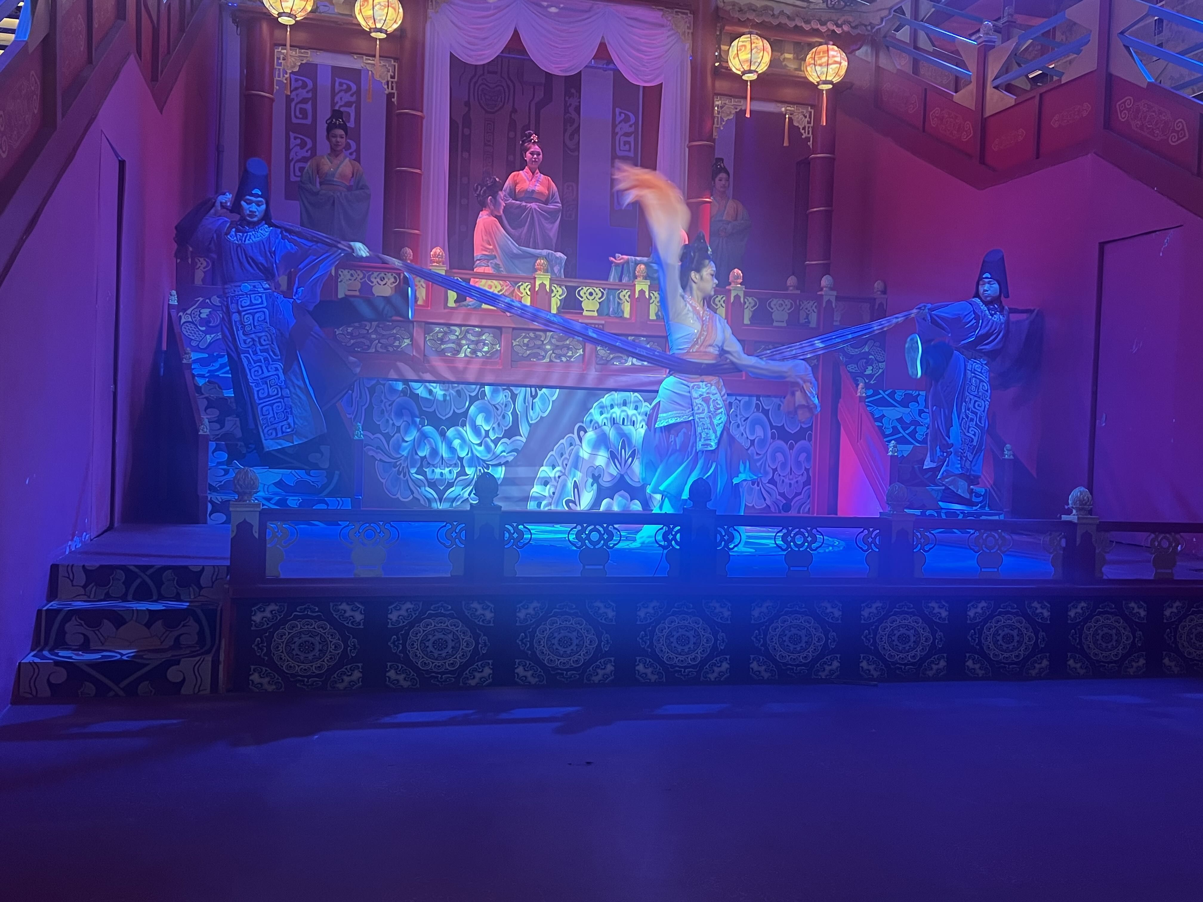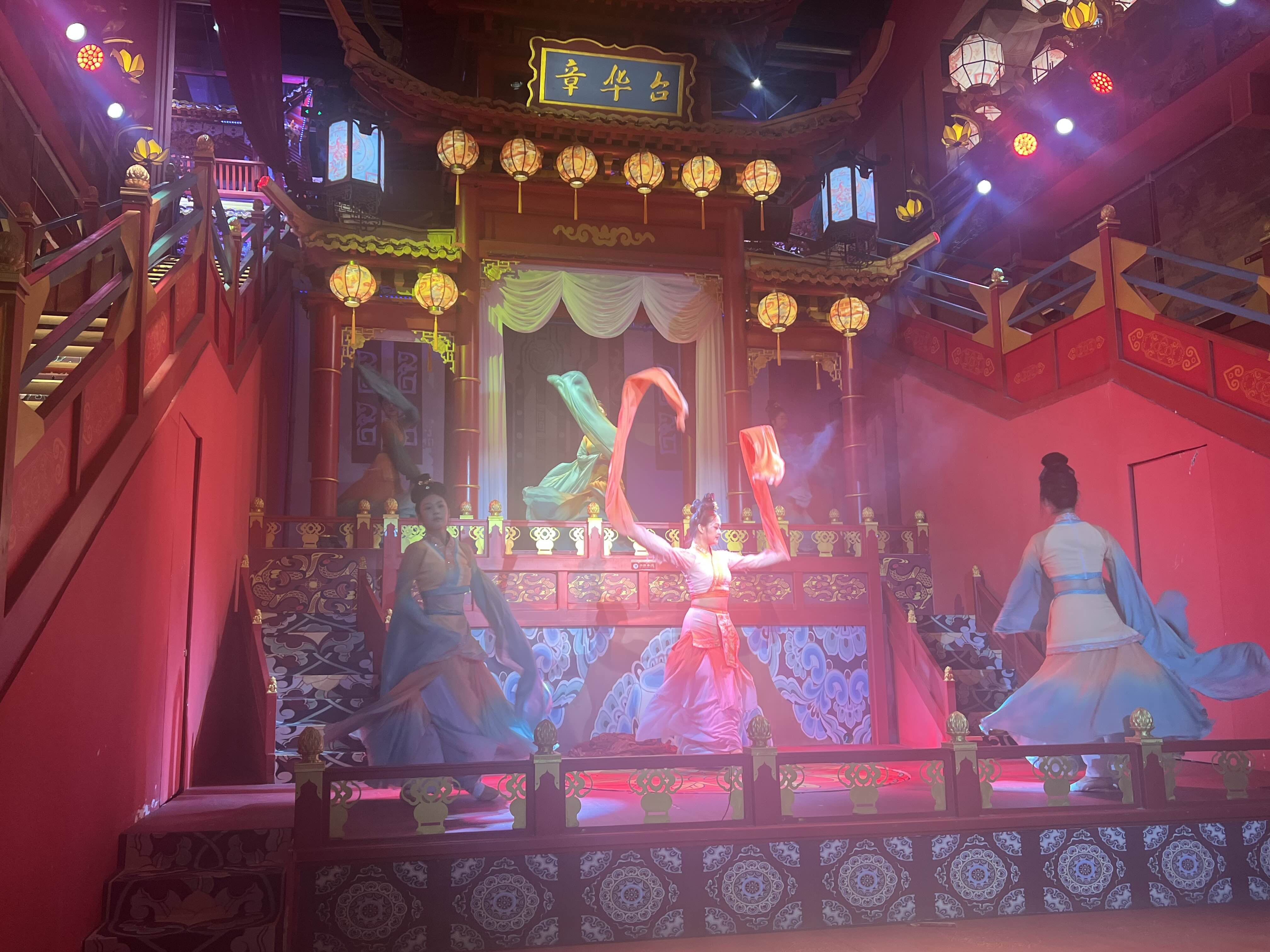 我的观演动线,亦是一场寻楚之旅:一楼的木船上,苏东坡与友人正泛舟吟哦,诗意盎然;拾级而上至二楼,昏暗神秘的光线下,《九歌·山鬼》的演绎如梦似幻;辗转间,又邂逅了翩跹的楚国宫廷舞与悲壮的《霸王别姬》;最终回到一楼章华台前,静静欣赏莫愁女的婉转故事。每场演出时长虽精短,却处处见巧思,演员们身姿曼妙、长袖翩跹,节目精致得让人挪不开眼。