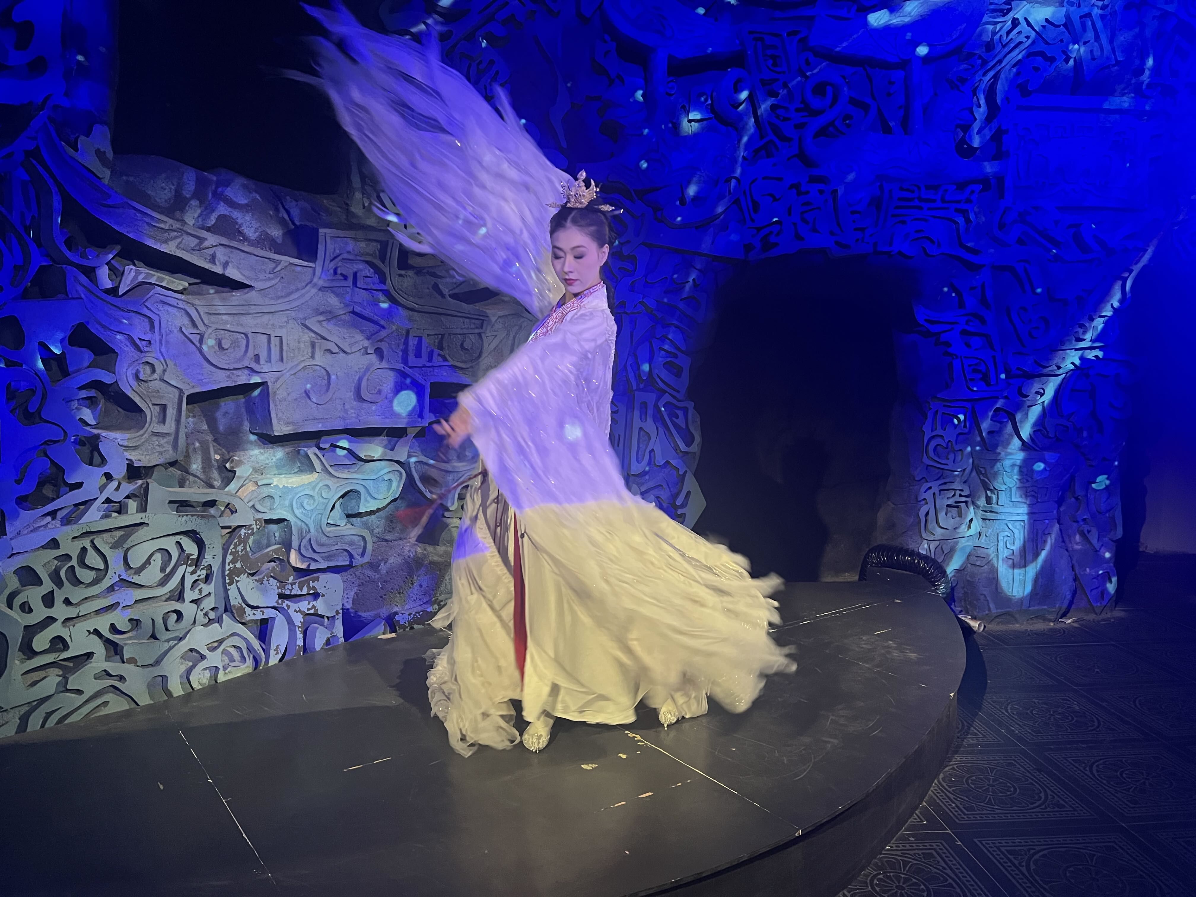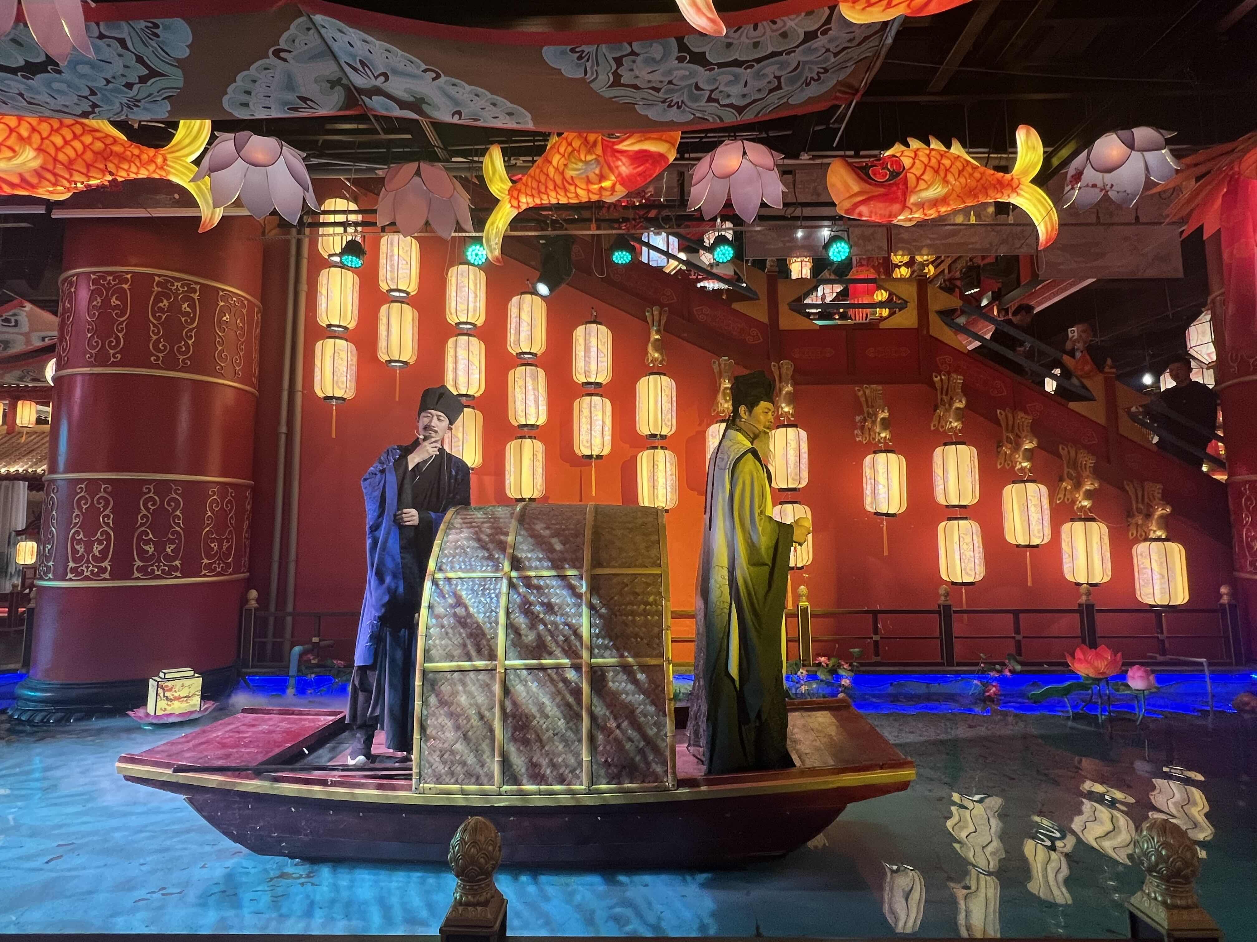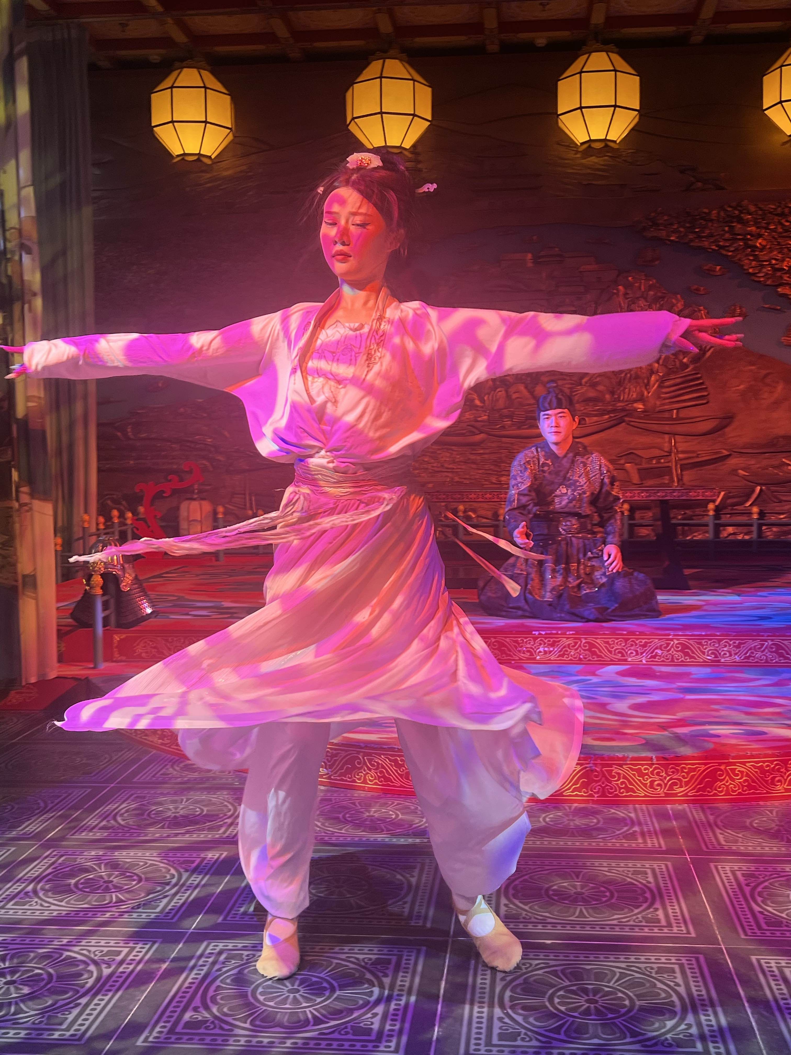 我的观演动线,亦是一场寻楚之旅:一楼的木船上,苏东坡与友人正泛舟吟哦,诗意盎然;拾级而上至二楼,昏暗神秘的光线下,《九歌·山鬼》的演绎如梦似幻;辗转间,又邂逅了翩跹的楚国宫廷舞与悲壮的《霸王别姬》;最终回到一楼章华台前,静静欣赏莫愁女的婉转故事。每场演出时长虽精短,却处处见巧思,演员们身姿曼妙、长袖翩跹,节目精致得让人挪不开眼。