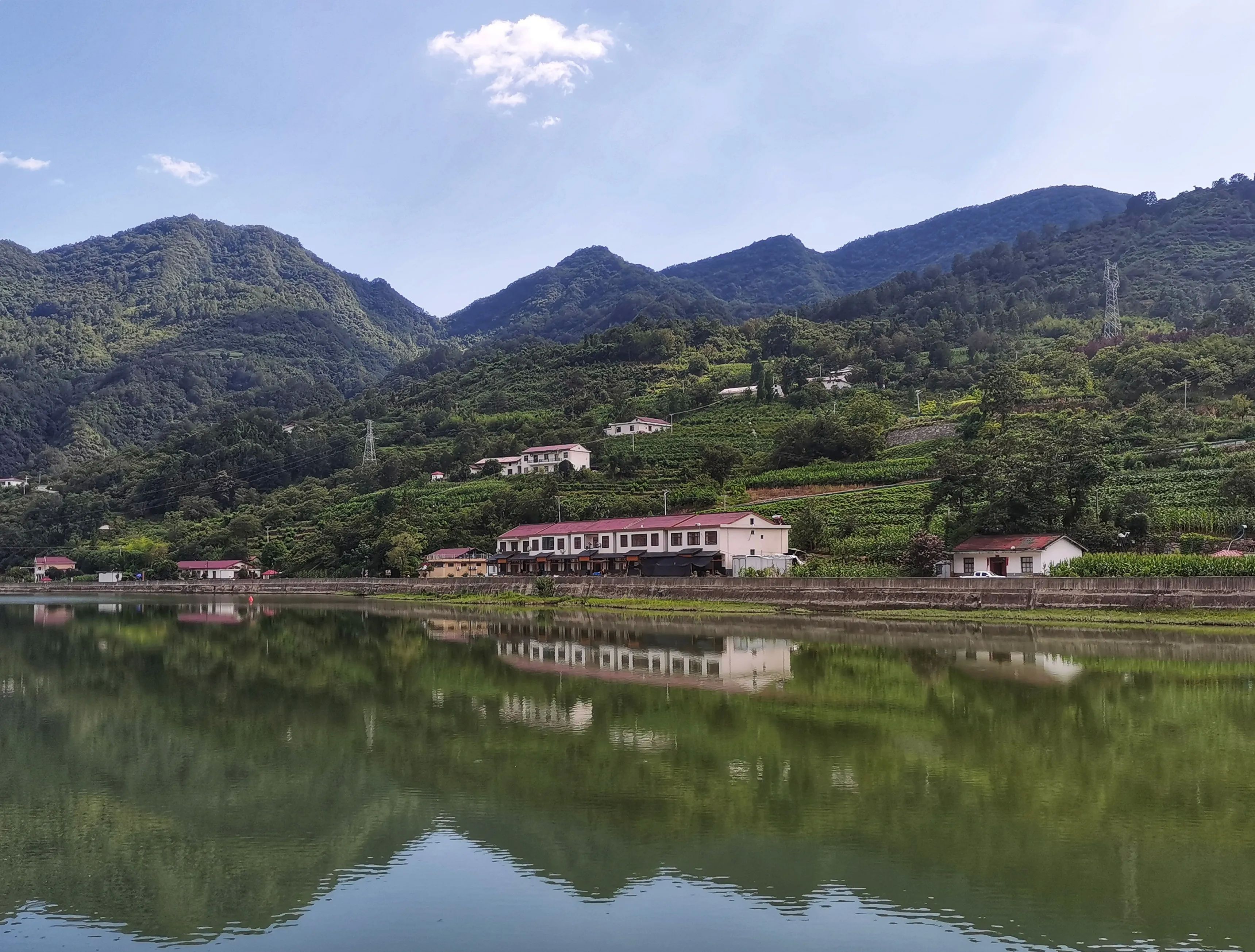 午后,寻至镇外水库。景象豁然开朗,一泓巨大的碧水宛如镶嵌在群山怀抱中的翡翠明镜。水面平滑如砥,完美倒映着湛蓝的天空、游走的白云以及四周层叠的深翠山影。阳光慷慨地洒下,揉碎了万点金光,在水波上轻盈地跳跃。择一水畔巨石坐下,清风徐来,带着沁人心脾的湿润水汽。耳畔是细浪轻吻岸石的沙沙声,偶尔有水鸟掠过晴空,留下一串清越的啼鸣。金台山门前的思辨,古镇的市声,旅途的微尘,此刻都被这浩渺澄澈的碧波温柔地涤荡、消融。心绪随之沉淀、舒展,仿佛被这无边的宁静与包容轻轻抚平了所有褶皱。