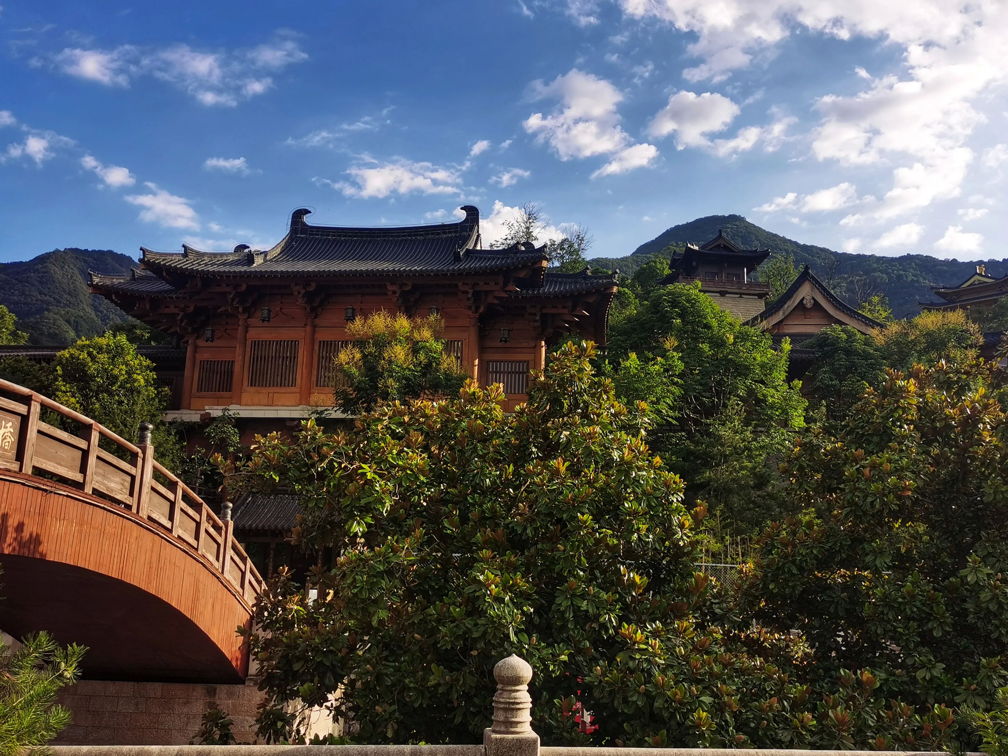 金台山并非想象中的深山古刹,而雄踞于镇安县城东侧,紧邻西康铁路镇安站,距包茂高速镇安出口仅1.2公里。它是一座被乾佑、金沙两河深情环抱的自南向北小山,四面绿意葱茏。这里的历史渊源极为深厚,可追溯至西晋,其核心——镇安古兴隆寺,更是唐密(密宗)的重要祖庭,早在唐玄宗开元年间便已存在。2014年复建时,依据密宗金刚界、胎藏界两部的根本教义,得名“金台山”。步入景区,严格按照唐密规制、采用古法营造的恢弘气象扑面而来。宝箧、大悲、尊胜、金台四大广场次第展开,空间疏朗庄严。如来门、金刚门、悉地门,重重门阙引领着探索的深入。目光所及,是巍峨的城门楼、古朴的前山门、跨越水面的千归桥、回荡梵音的钟鼓楼,以及核心建筑群——象征**胎藏界(理平等)的殿宇、供奉本尊的开元殿、象征金刚界(智差别)的殿宇、幽静的月光阁、进行重要仪轨的灌顶院,以及体现“一念三谛”圆融思想的一味三塔院。整个景区完美诠释了“金台密境,隐城佛国”的主题,既是参学礼拜的圣地,也是感受盛唐建筑美学、寻求禅意静养的绝佳之所。