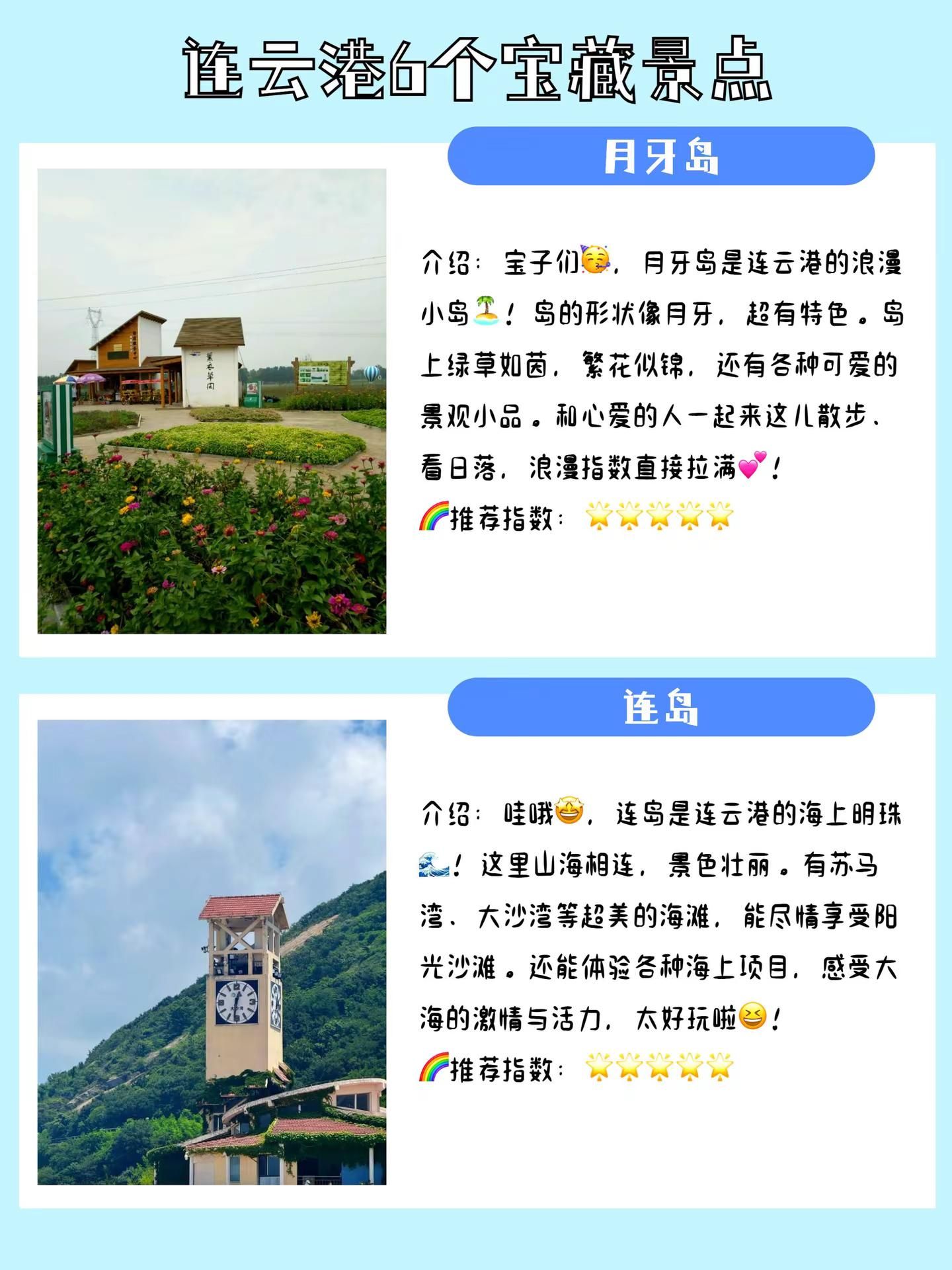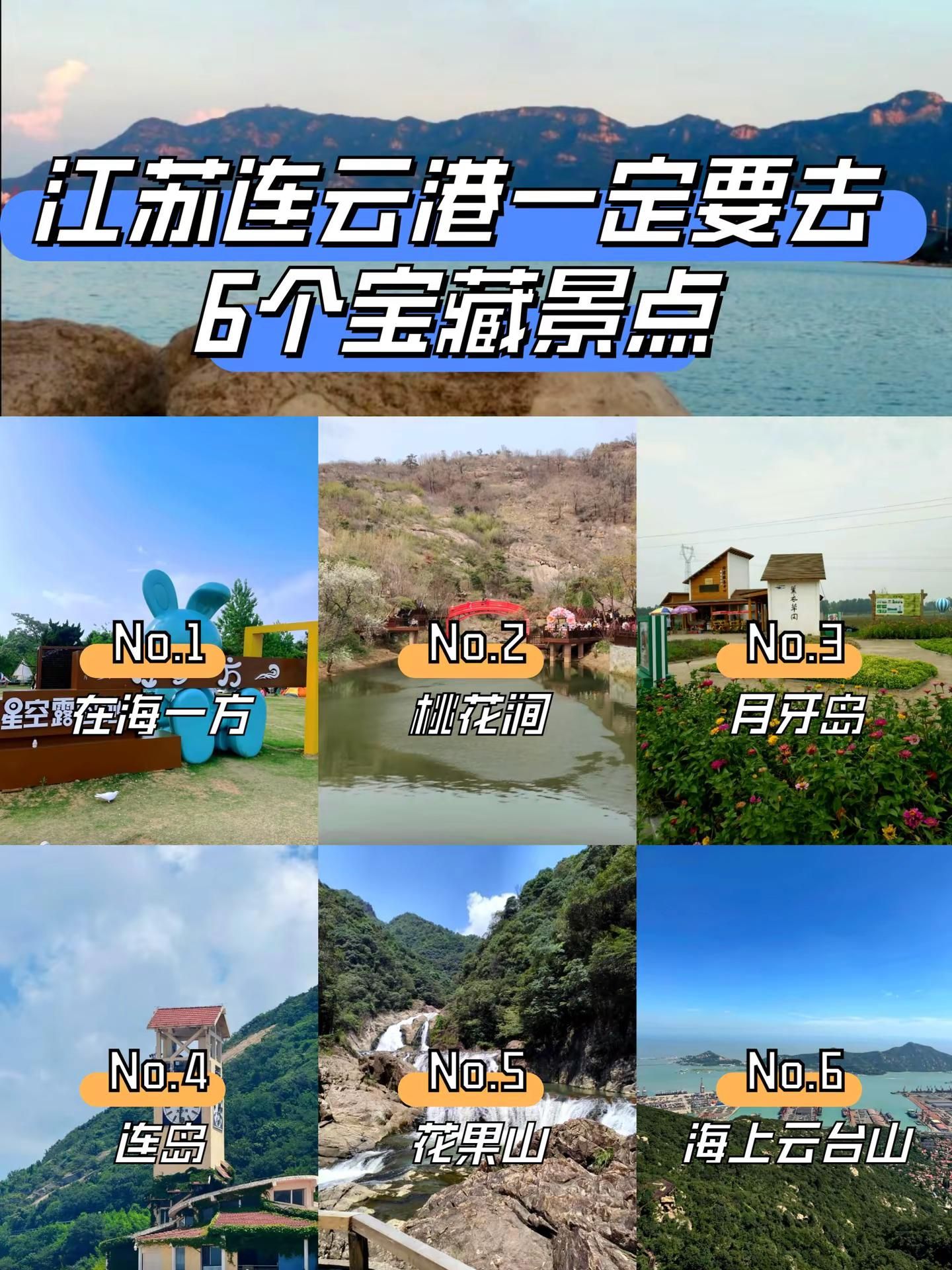 江苏连云港旅游必去的6个宝藏景点推荐。连云港是一座山海相拥的旅游城市,西游文化的发源地,在这里追寻大圣的足迹,还能大饱口福,享受价廉物美的海鲜盛宴。整理推荐6个来连云港旅游必打卡的景点,有需要的宝子码住收藏~~~【在海一方】介绍:连云港的“滨海休闲乐园”来啦!在海一方沙滩柔软,海风轻拂超惬意,和家人一起踏浪、堆沙堡,或者拍张“海滨小玩家”照,你就是朋友圈的“海滨欢乐小达人”!推荐指数:游玩亮点:沙滩柔软、海风惬意、海滨小玩家打卡 【桃花涧】介绍:连云港的“粉嫩桃花秘境”上线!桃花涧桃花盛开,粉嫩如霞超浪漫,和恋人一起漫步、赏桃花,或者拍张“桃花小情侣”照,你就是朋友圈的“浪漫小主角”!推荐指数:游玩亮点:桃花盛开、粉嫩如霞、桃花小情侣打卡 【月牙岛】介绍:连云港的“月牙形梦幻岛”来啦!月牙岛形状独特,湖水清澈超宁静,和好友一起骑行、看日落,或者拍张“月牙小旅人”照,你就是朋友圈的“宁静小达人”!推荐指数:游玩亮点:月牙形状、湖水清澈、月牙小旅人打卡 【连岛】介绍:连云港的“海岛度假天堂”上线!连岛海岛风光美,海水清澈超嗨皮,和度假搭子一起游泳、晒太阳,或者拍张“海岛度假小达人”照,你就是朋友圈的“度假小明星”!推荐指数:游玩亮点:海岛风光美、海水清澈、海岛度假小达人打卡 【花果山】介绍:连云港的“齐天大圣老家”来啦!花果山猴子机灵,传说神秘超有趣,和娃一起看猴子、探秘境,或者拍张“花果小粉丝”照,你就是朋友圈的“神话小探险家”!推荐指数:游玩亮点:猴子机灵、传说神秘、花果小粉丝打卡 【海上云台山】介绍:连云港的“海上仙山奇境”上线!海上云台山云雾缭绕,山海相依超震撼,和摄影小伙伴一起登山、拍云海,或者感受那份仙山的缥缈与神秘,你就是朋友圈的“仙山小摄影师”!推荐指数:游玩亮点:云雾缭绕、山海相依、仙山小摄影师打卡#连云港旅游 #连云港旅游景点 #连云港必去景点 #连云港旅游推荐官