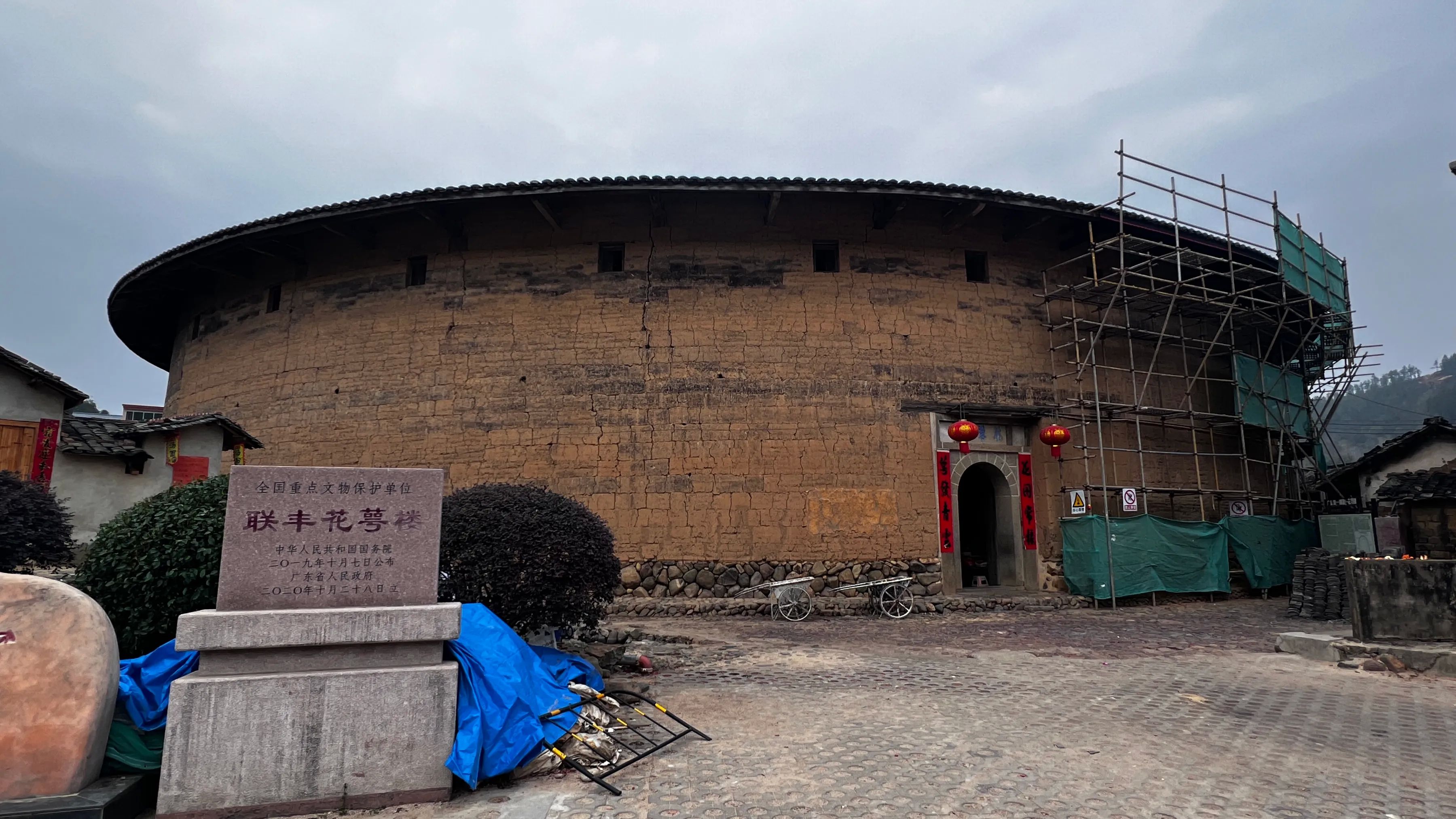 3、梅州·大埔·花萼楼: 国宝单位。近400年历史的客家土围楼,因形似花萼,且取意兄弟邻居相亲相爱,故名“花萼楼”。是广东土围楼中规模最大、设计最精美、保存最完整的民居古建筑。花萼楼的修缮,有一处是在二楼,将原有的部分瓦片改成木板,就可以坐上去了,特有体验感。