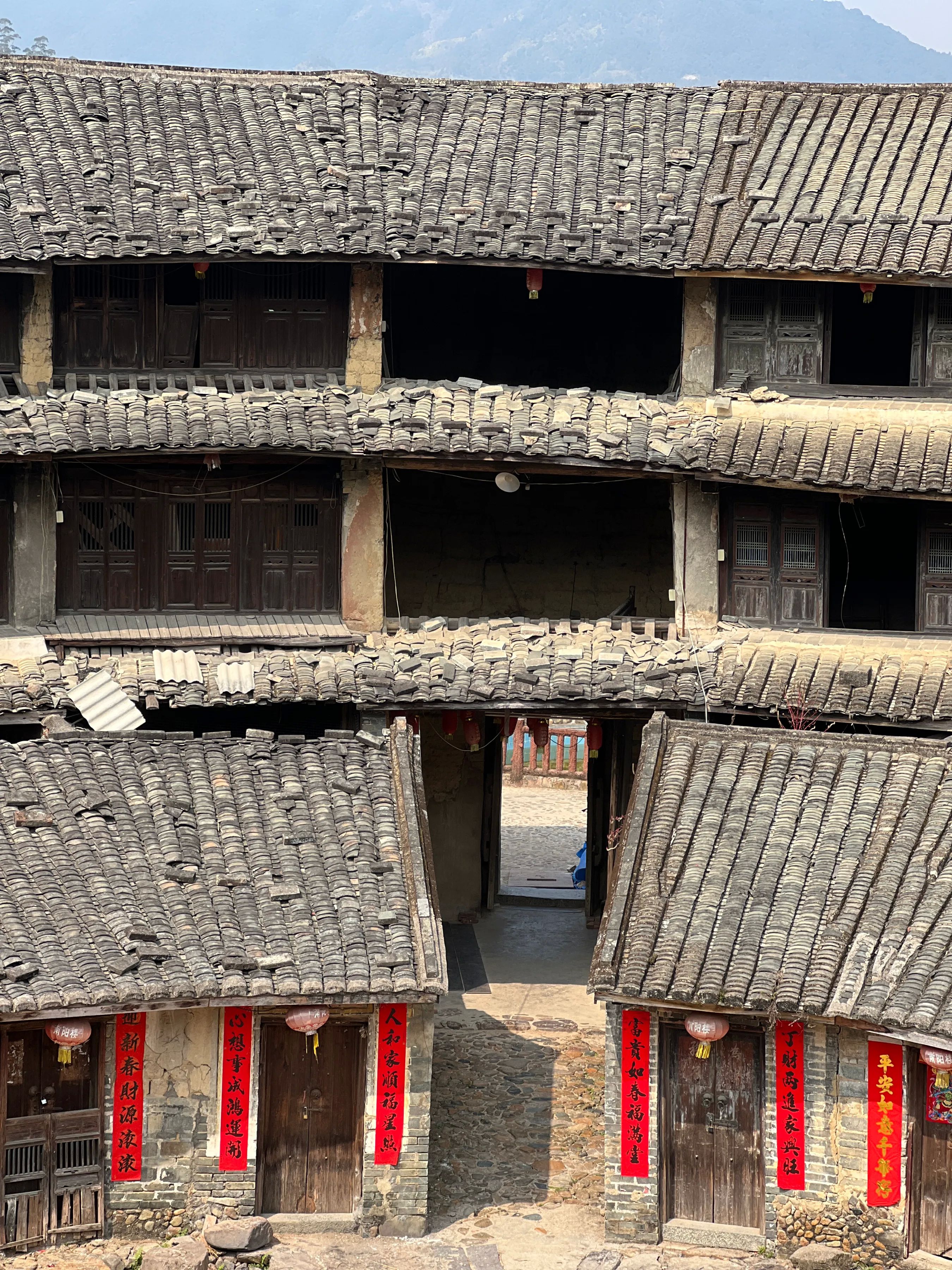 导航,停在福海楼,荒废中,无人居住。出门往左走几步,就到了东华楼。二进围屋,是新中国成立初期土楼建筑的典型代表。瓦屋上长满了花草,楼里仍居住着2户人家3个80多岁的老人,不愿离去。继续往左走,就到了南阳楼。南阳楼,距今有600多年历史,列为省保单位,三级财政拨款200万元,进行修缮,已有1年多时间,仍在进行中。
