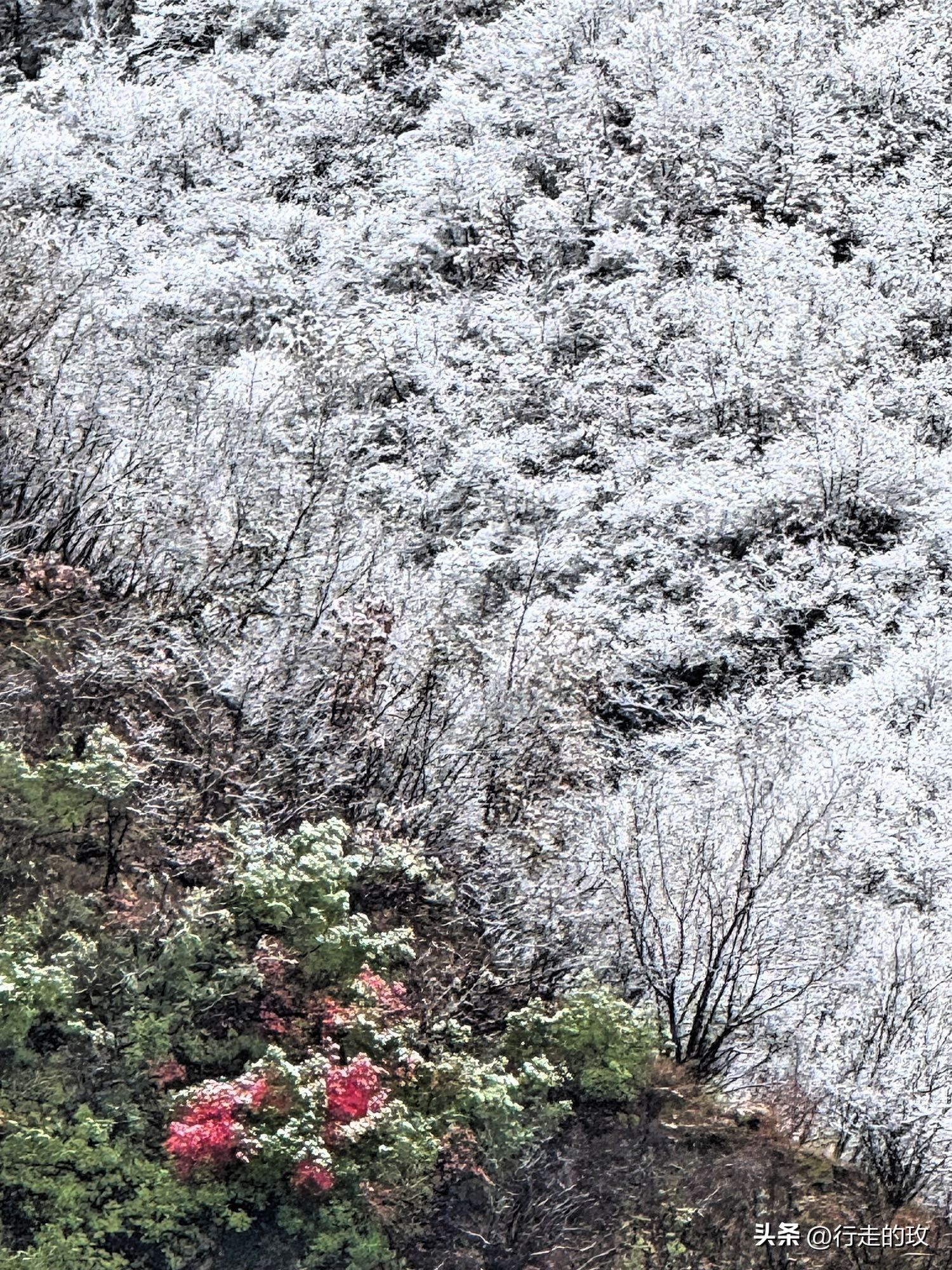 有的路段,漫山遍野银装素裹,有的路段一簇簇红叶正红,被绿色的植物包绕。秦岭多彩的秋就这样被我们偶遇了。