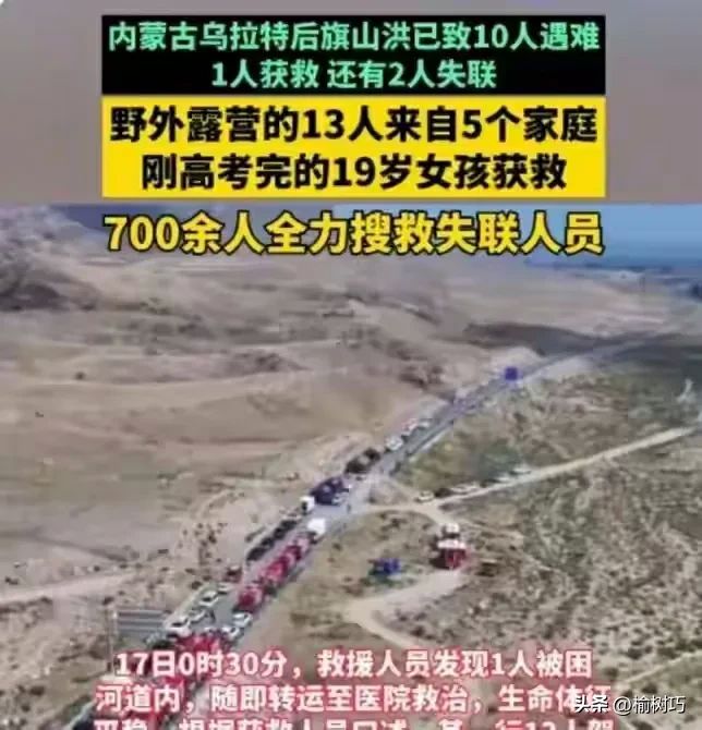 上周六晚上,在内蒙古乌拉特后旗出了令人惋惜的事故,五个家庭十多口人在野外露营,结果突遇山洪都被冲走了。
