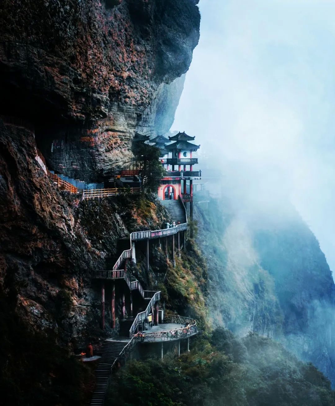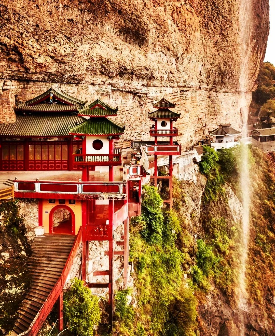 8. 灵通岩悬空寺:比悬空寺更惊险的闽南第一山!雨季能看到千米瀑布,穿寺而过的奇观,记得带硬币贴"灵石"祈福。登顶青云寺需攀垂直铁梯,胆小慎入!