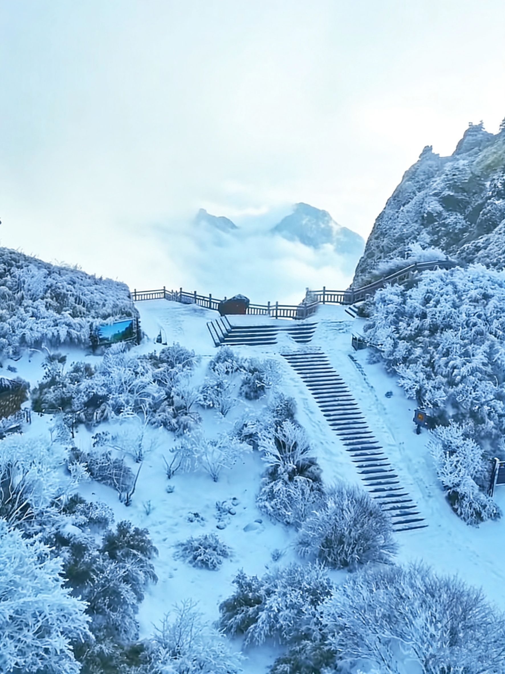 神农顶(华中屋脊):海拔3106米的雪景绝了!雾凇挂满松枝,神农谷栈道穿行云海,板壁岩的雪蘑菇拍特写超出片,清晨还能偶遇“云浪吞山”盛景
