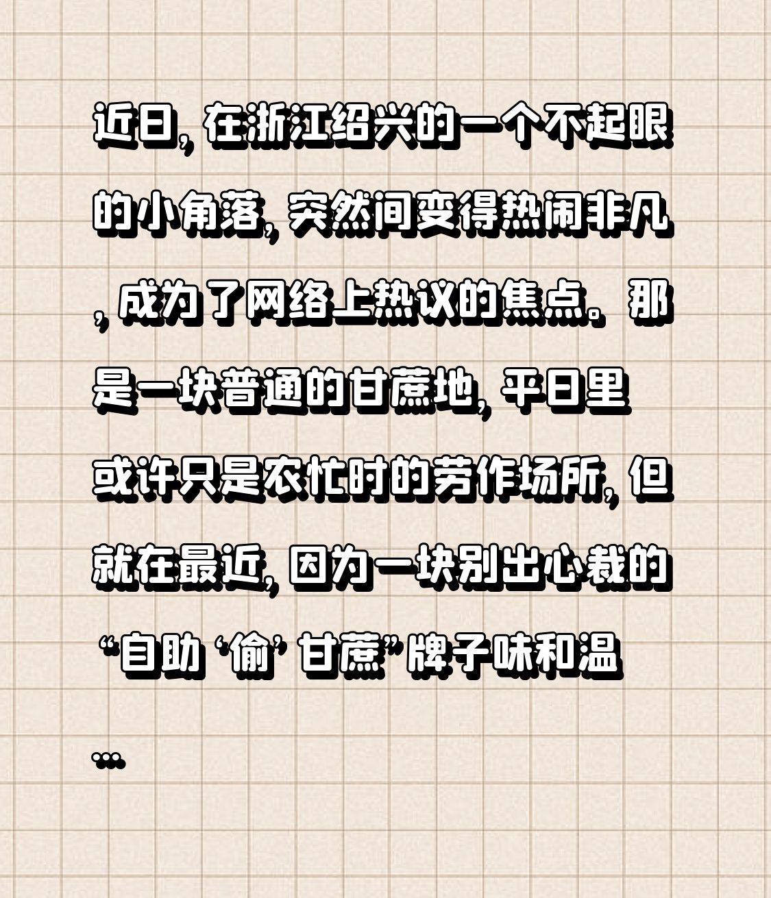 近日,在浙江绍兴的一个不起眼的小角落,突然间变得热闹非凡,成为了网络上热议的焦点。那是一块普通的甘蔗地,平日里或许只是农忙时的劳作场所,但就在最近,因为一块别出心裁的“自助‘偷’甘蔗”牌子,它瞬间变成了网红打卡的新宠。这块甘蔗地的主人,正是一位80后农民,名叫王勇龙。凭借一份充满趣味和互动的创意,他让这片平凡的土地变成了一个充满童趣的“游戏场”,吸引了络绎不绝的网友前来体验。
