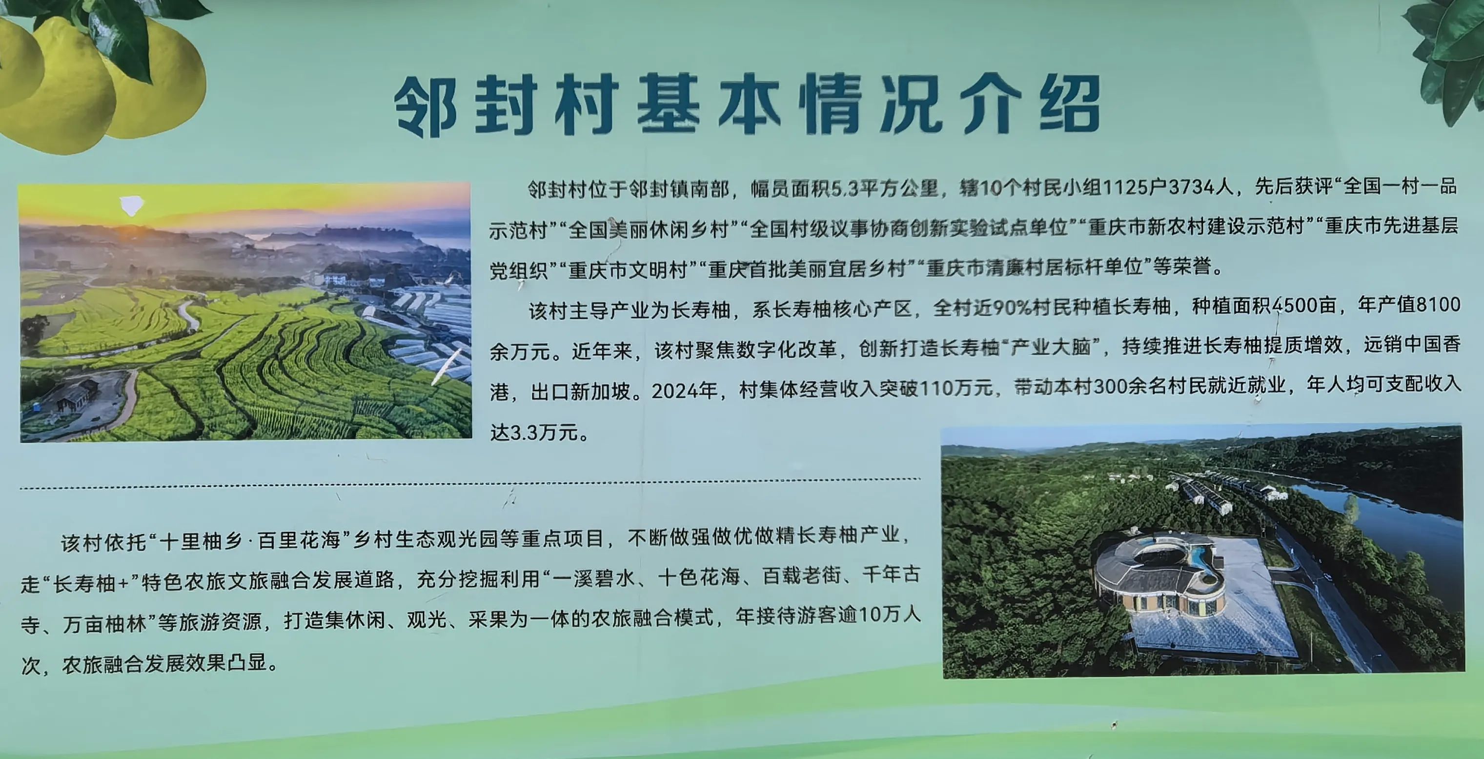 沙田柚生态旅游区与长寿湖景区联动,发展采摘体验(11月成熟期)、柚文化节(“柚王”拍卖、公益捐赠)等乡村旅游项目。开发“柚子宴”、柚皮扣、柚子酒等特色食品,形成“邻封三宝”饮食文化。