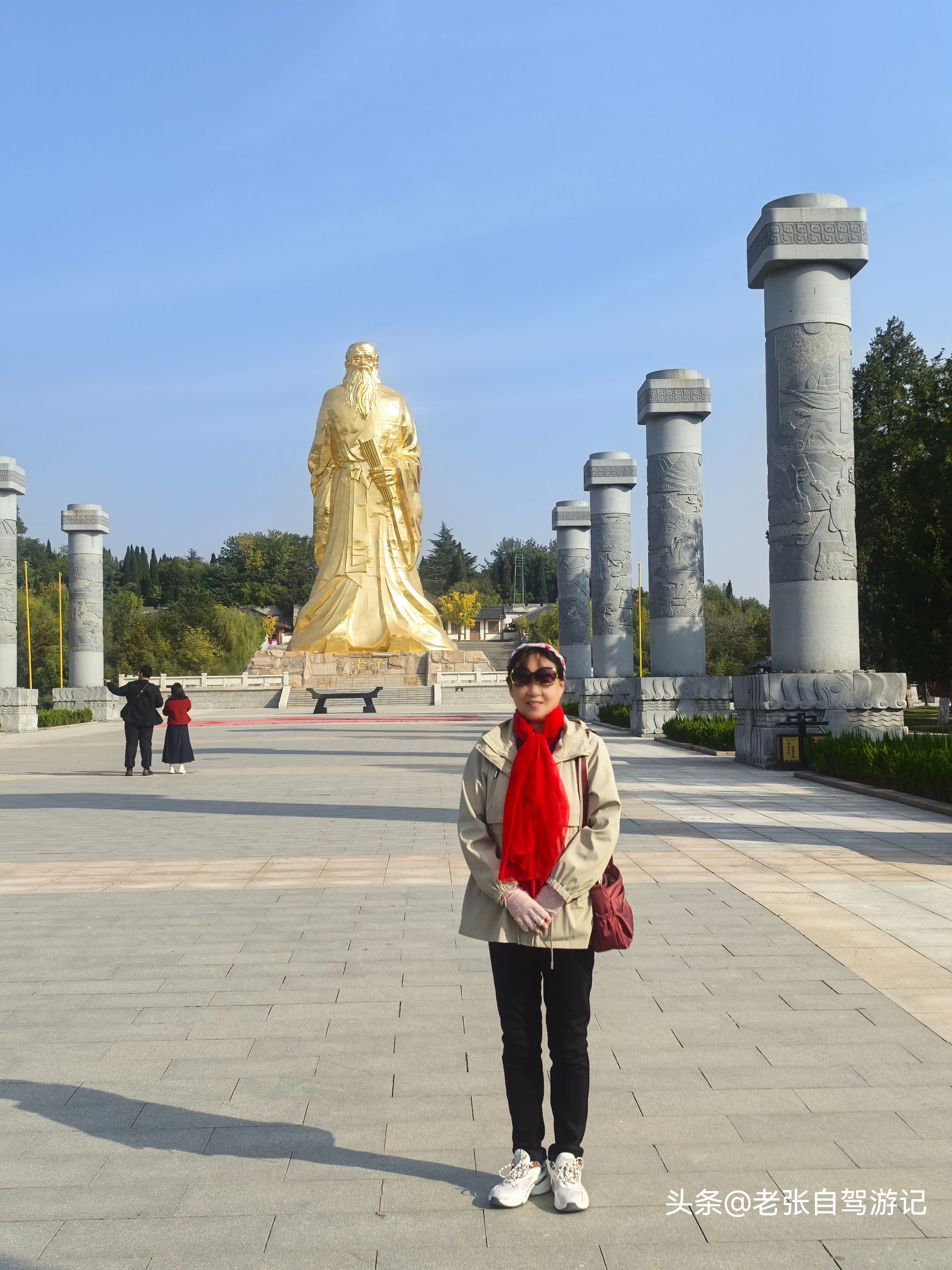 图1,下了观光车,老子的巨大铜像是老子文化广场的重要标志。广场附近的墙上,刻着世界上规模最大的《道德经》。
