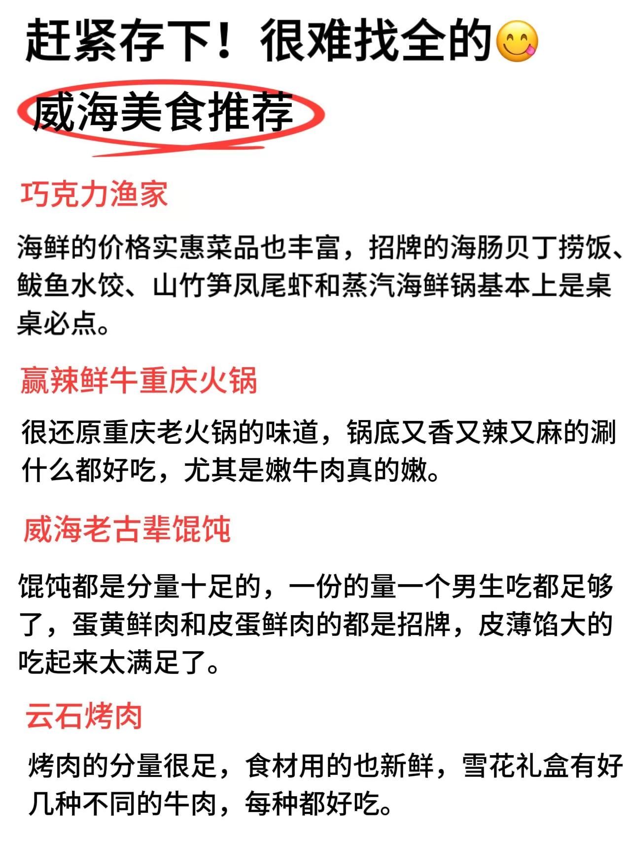去威海前,还是听点大实话吧。。。。刷了无数篇威海旅游攻略,发现每个人对威海的看法都不一样,玩法也有区别,根据我的个人经验整理了一份攻略都是我的真实体验,建议收好~-威海建议去的景点威海公园:标志性的大相框是必拍的打卡点,能拍到海天一色的美景。刘公岛:里面有甲午战争博物馆和炮台,是一个很有历史意义的地方。半月湾沙滩:这个季节的半月湾逛起来很舒服,还能看到很美的日出。猫头山:从高处往下俯瞰的美景真的绝了,远处看过去就跟猫猫的身体一样。金海湾栈桥:站在栈桥上拍照真的很有氛围,白天可以看海傍晚看日落也很美。火炬八街:虽然毕竟商业化但完全不影响它的美,站在街头还能看到大海。小石岛:是一个赶海的好地方,能带着小桶过来挖小螃蟹和贝壳。那香海:蓝天白云大海的怎么拍照都好看,沙滩踩起来软软的很舒服。鸡鸣岛:要坐船才能上岛去观赏,风景很美还能看到蓝蓝的大海。布鲁维斯号:沉船配上海鸥拍照真的巨出片,不同角度拍出来都会不一样。神雕山动物园:是一个很大的动物园,动物也多,尤其是大熊猫真的太可爱了。成头山:如果不赶时间的话可以看日出,还能走到头去打卡山尽头立碑。#山东威海 #威海旅游攻略 #威海旅行 #威海美食 #威海网红打卡地