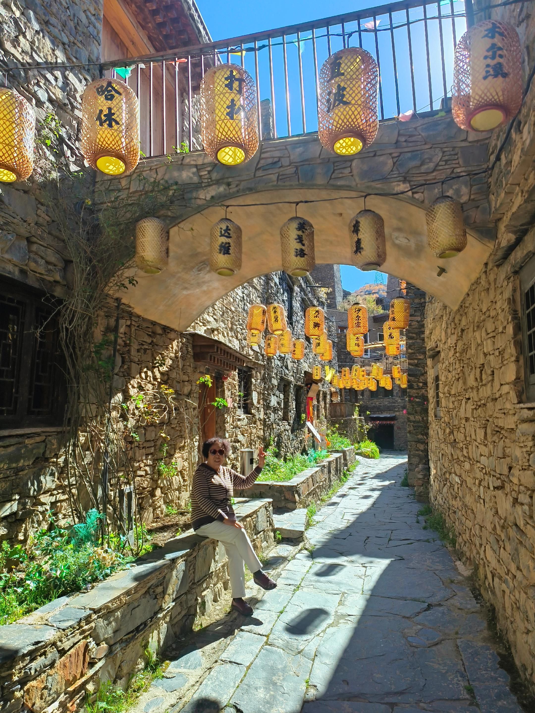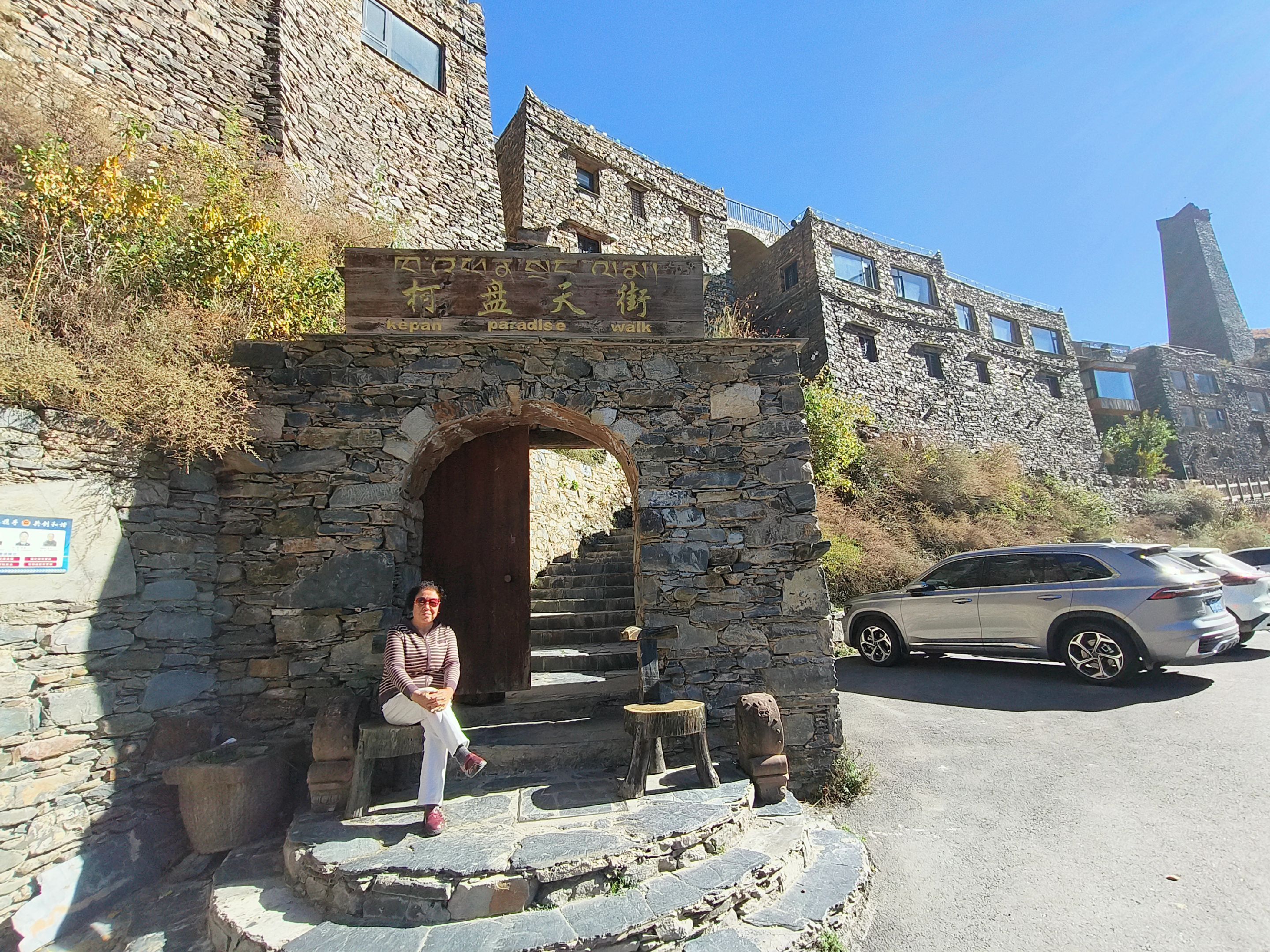 从548国道拐到317国道往东一点,就到了马尔康市松岗镇的“柯盘天街”。这个柯盘天街是古人建设在山顶上的一个碉堡型住宅,可以俯瞰松岗镇全貌。现在被改为天街了,里面很多民宿和商店。