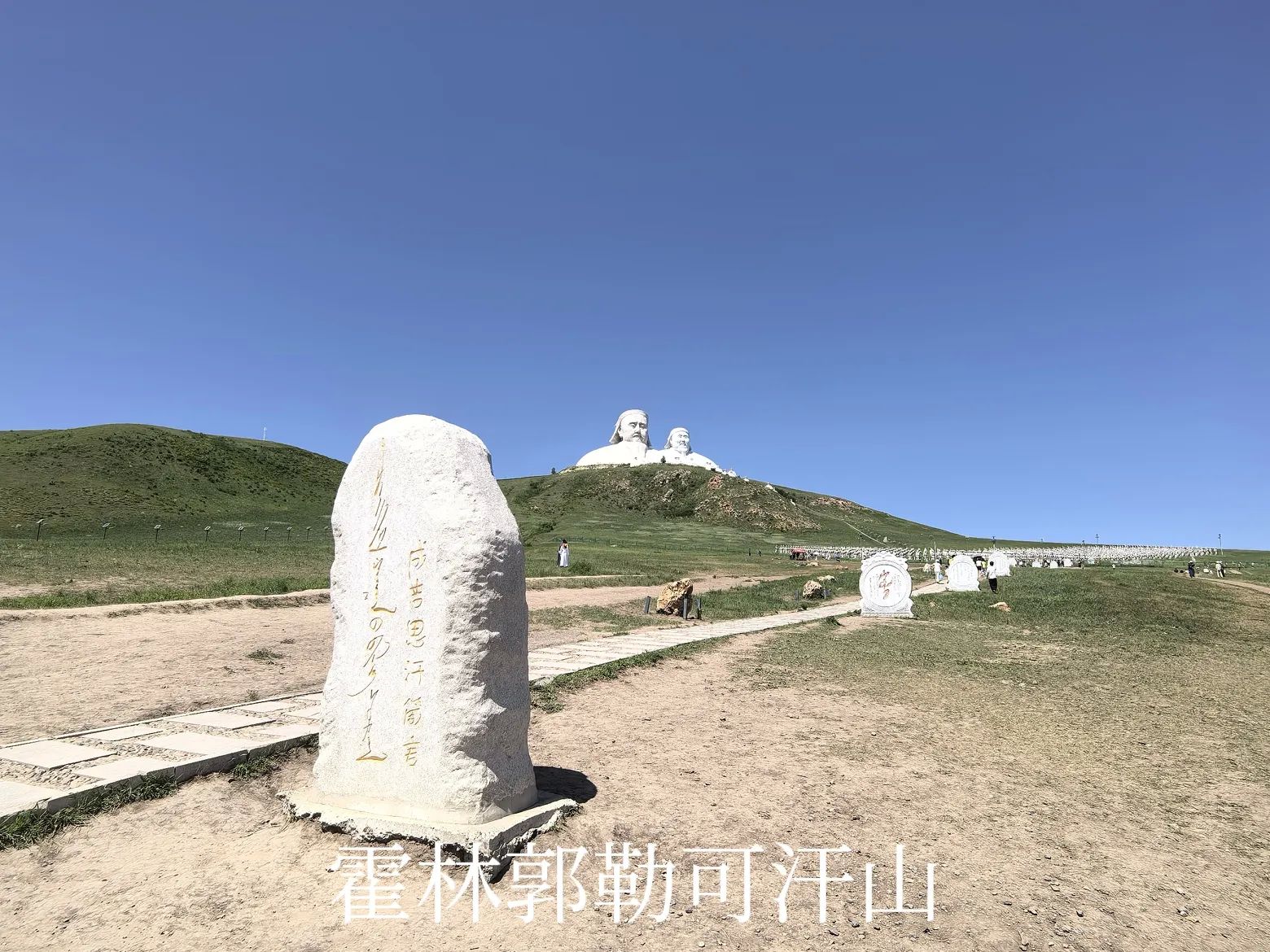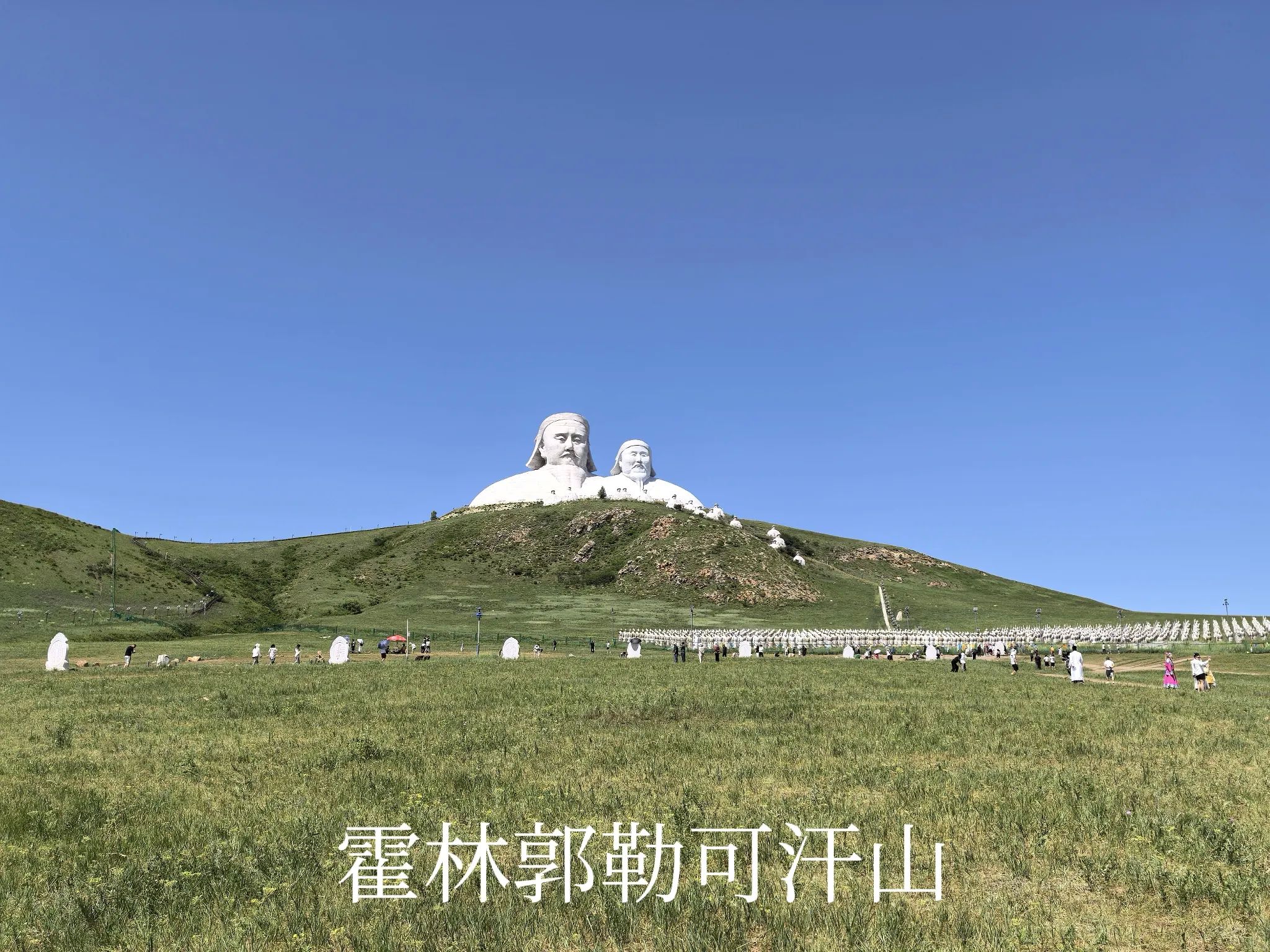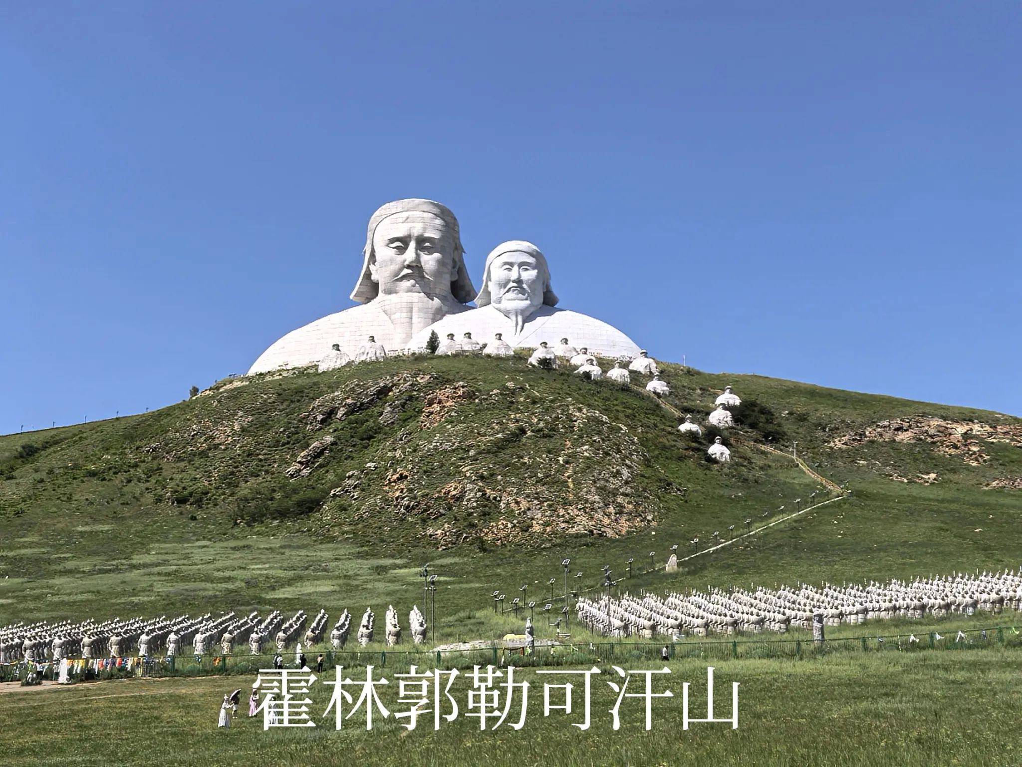 可汗山是简称,这是原来规划的度假区,名字叫浑迪音山旅游度假区,不知是因为经营状况不好还是违规建设,度假区的核心部分已经全部封闭起来,没有运营的迹象。游人只是在可汗山的山脚下,远距离观赏山顶的成吉思汗、忽必烈雕像,以及山脚的蒙元兵阵。来此打卡的游人还不少,也因此有当地牧民开展骑马穿越草原、蒙服拍照、餐饮等经营活动,招揽游客。