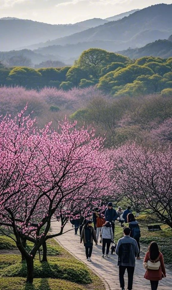 • 梅花品种与规模:梅花山全园占地约1500亩,植梅35000余株,品种约380余种,其中国际登录梅品种155个。这里是中国四大梅园之首,梅花品种丰富,包括珍贵的“别角晚水”品种。