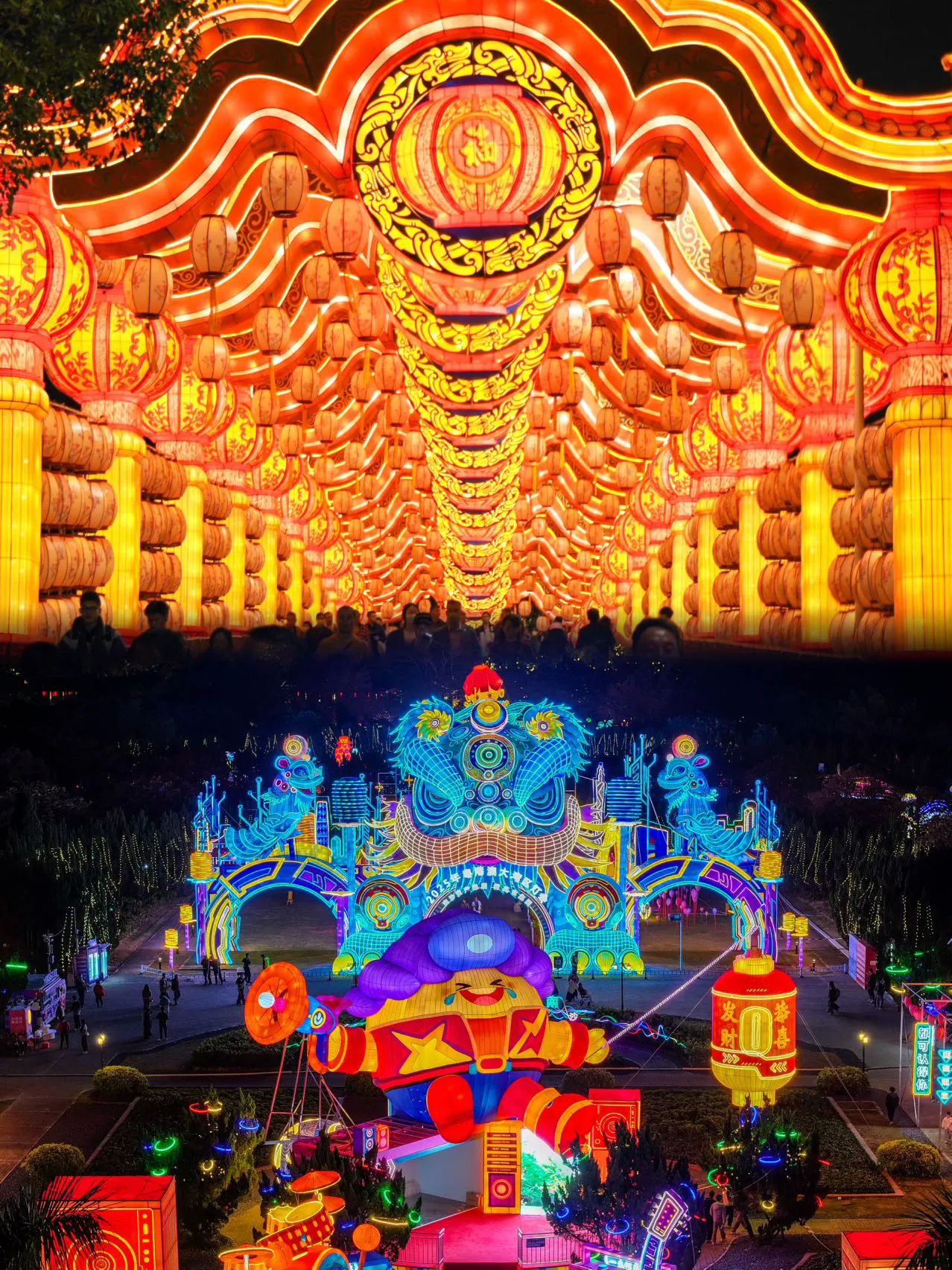 赛博醒狮:传统岭南醒狮与赛博朋克风融合,入口灯门超有气势。