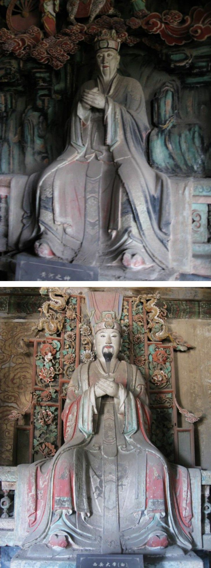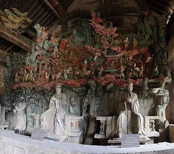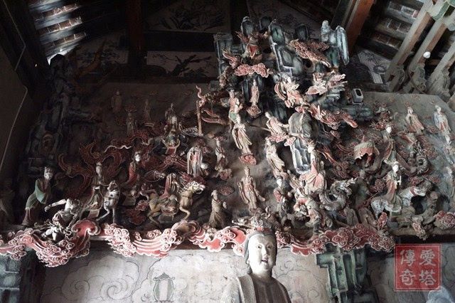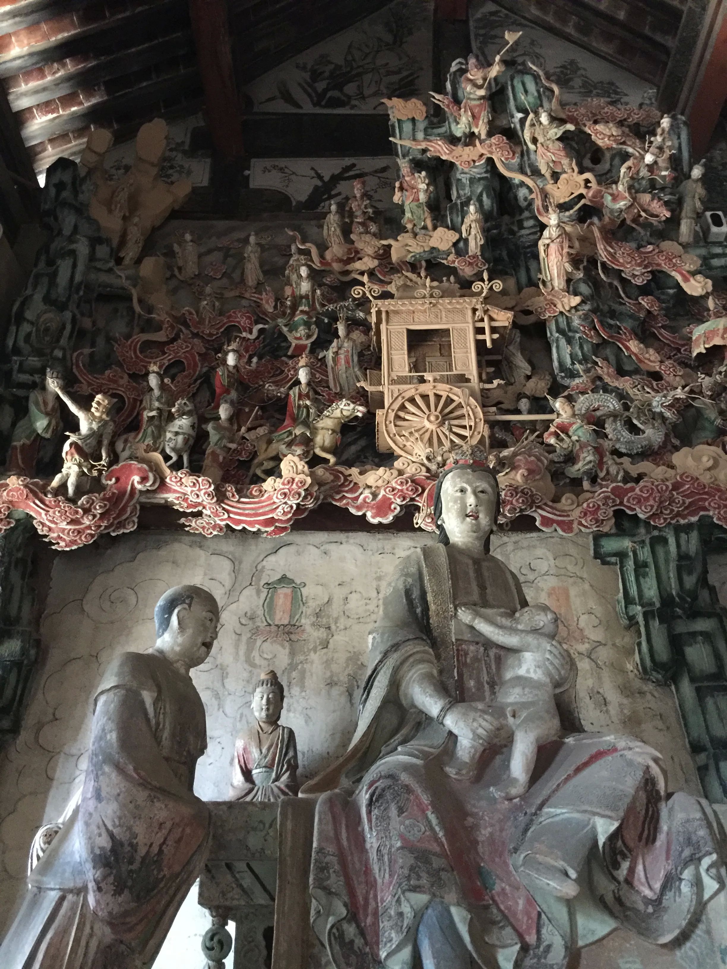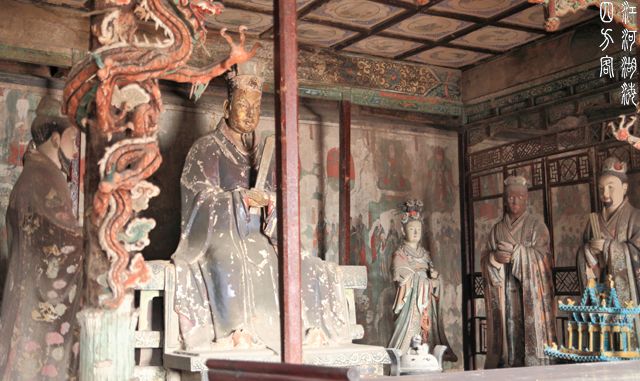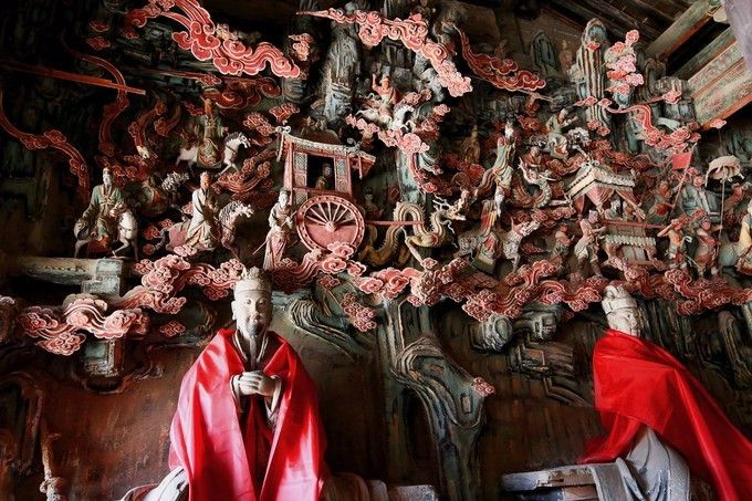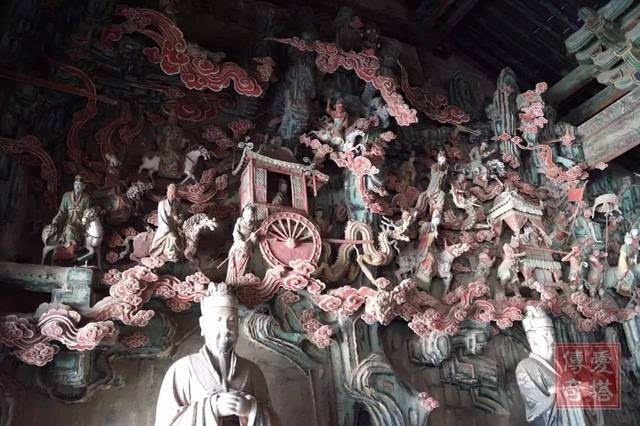 但真正的精华,藏在东西配殿——五岳殿和四渎殿。殿内环绕的悬塑艺术,堪称中国雕塑史的绝唱!天神御龙、仙官出行,人物、楼阁、山水悬空而塑,层次分明,动感十足,仿佛将整个天界“搬”到了墙壁上,立体感与想象力登峰造极。这不仅是艺术,更是金代工匠关于宇宙想象的终极表达。