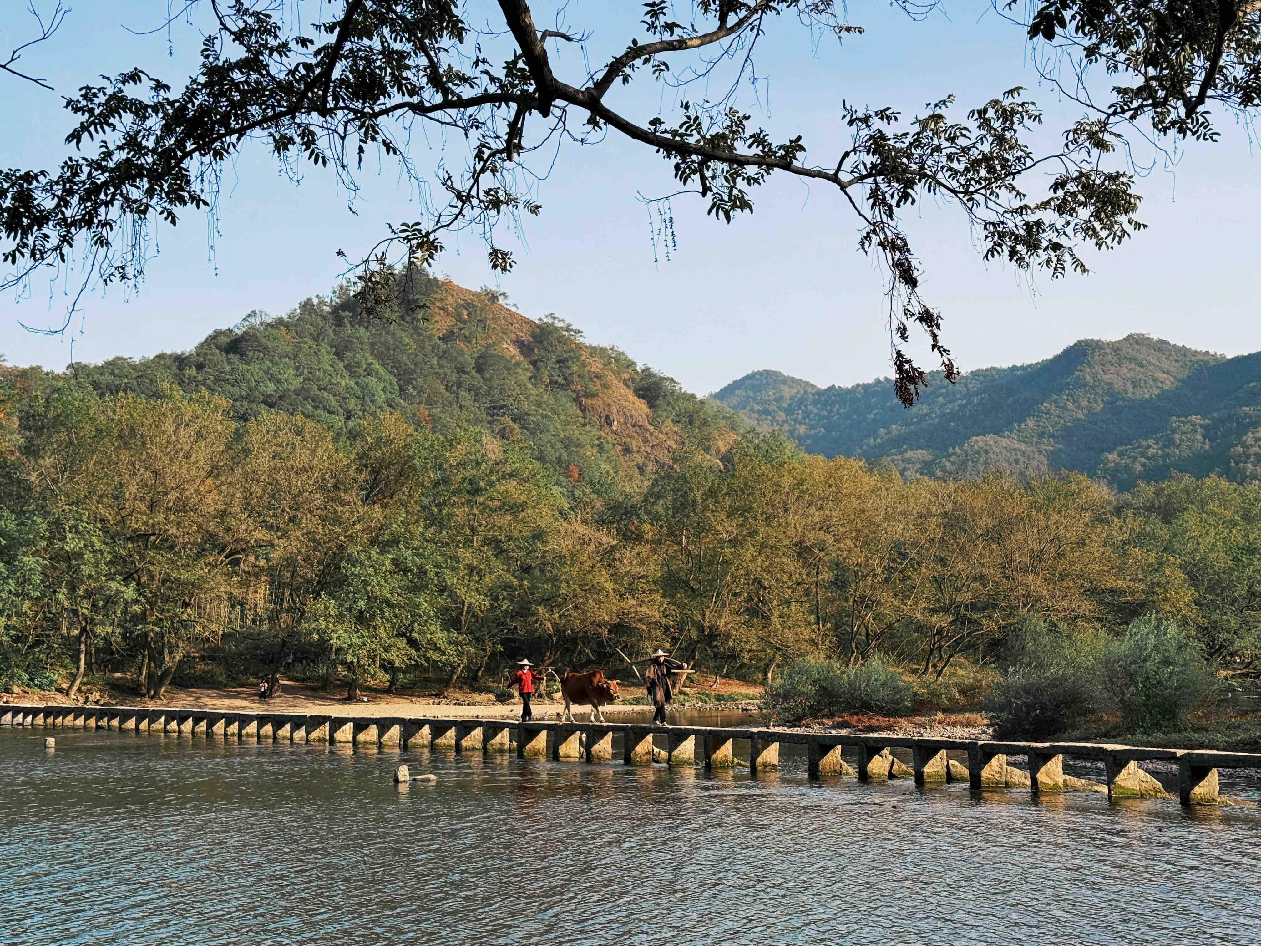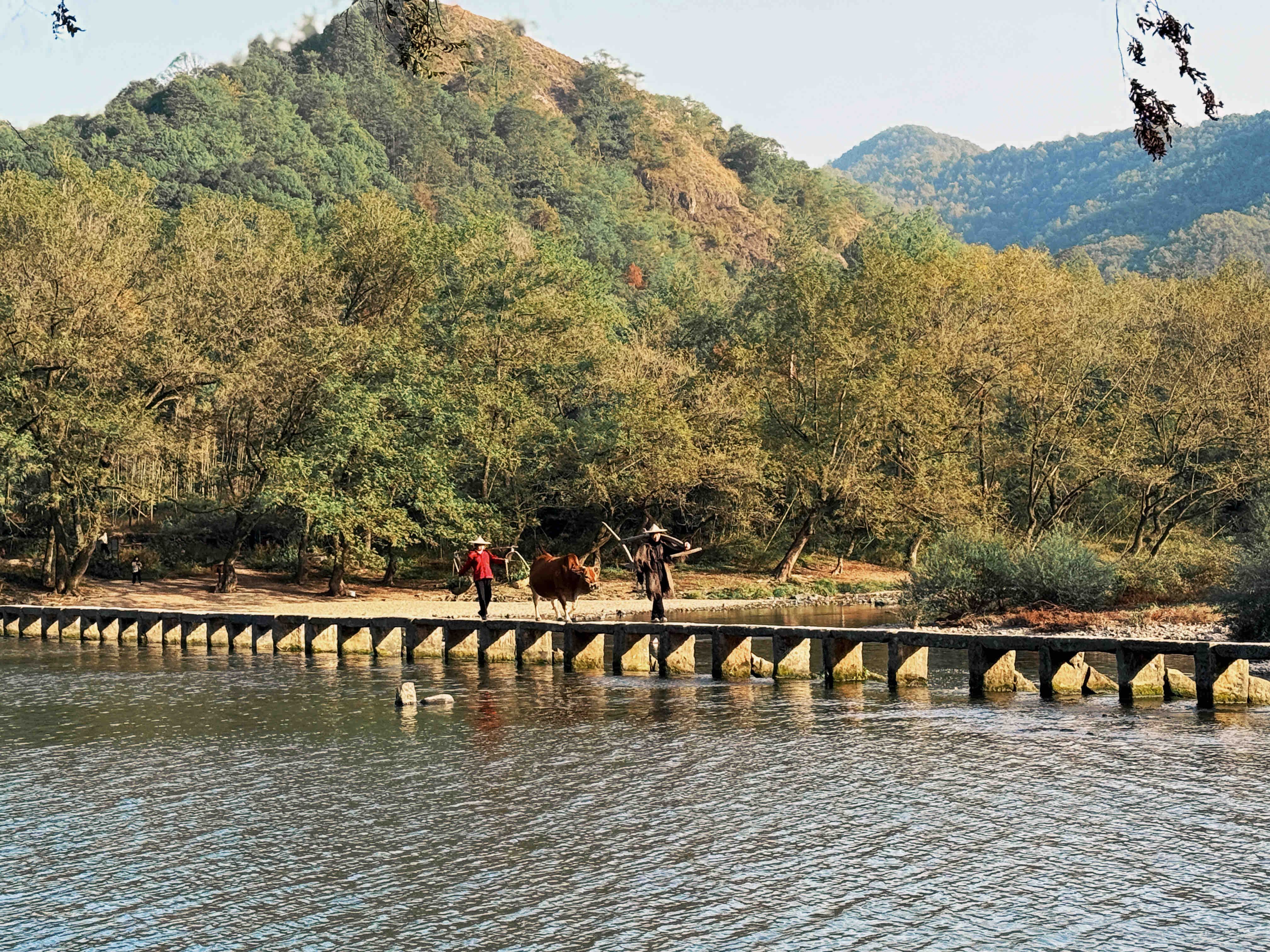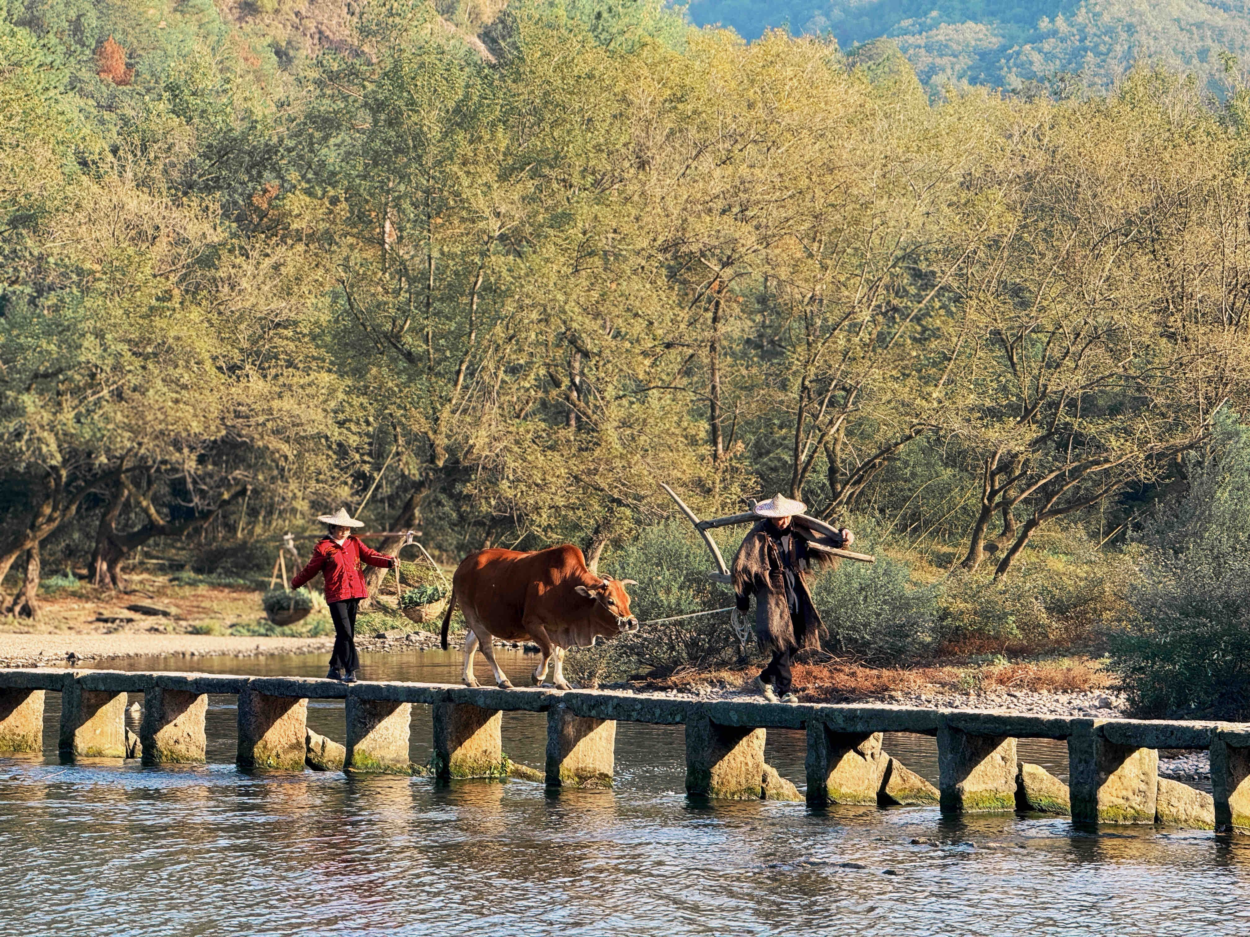 正走着,旁边的保安大叔喊,快点快点,走快点!牛来了!!我们运气真好,本来非周末没有表演的老牛过溪,因为有豪气的旅客付了款,让我们也有缘一睹风采。在最佳观测点,拍出来真的如小学语文课本封面复印(除了少一点点水面升起的烟雾缭绕的仙气)。2.0小姐姐因为晕溪水走的慢了,保安叔叔牵着过溪被热心群众喊“最美保安”这一刻也是笑点满满了。