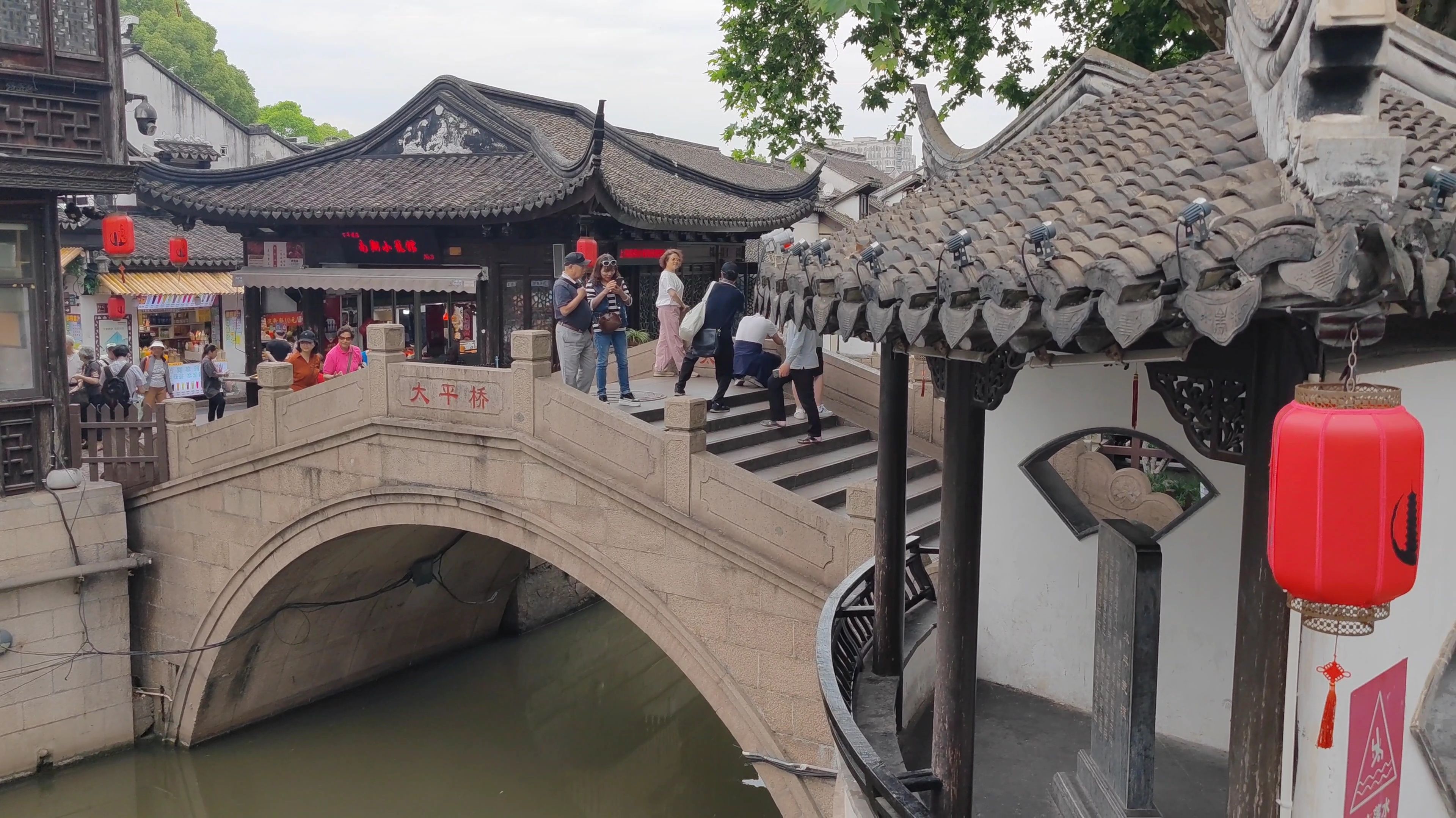 走到老街深处,能看见两座特别的桥——太平桥和吉利桥,当地人常说“走过太平桥,吉祥如意;踏过吉利桥,平安顺遂”。两座桥都是石拱桥,桥身爬着淡淡的青苔,栏杆上的石狮虽有些斑驳,却依旧透着精气神。站在桥上往下看,河水缓缓流淌,偶尔有乌篷船划过,船桨搅碎水面的光影,连带着岸边的白墙黛瓦也在水里晃悠,活像一幅流动的画。