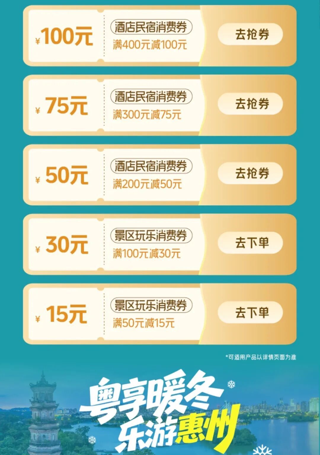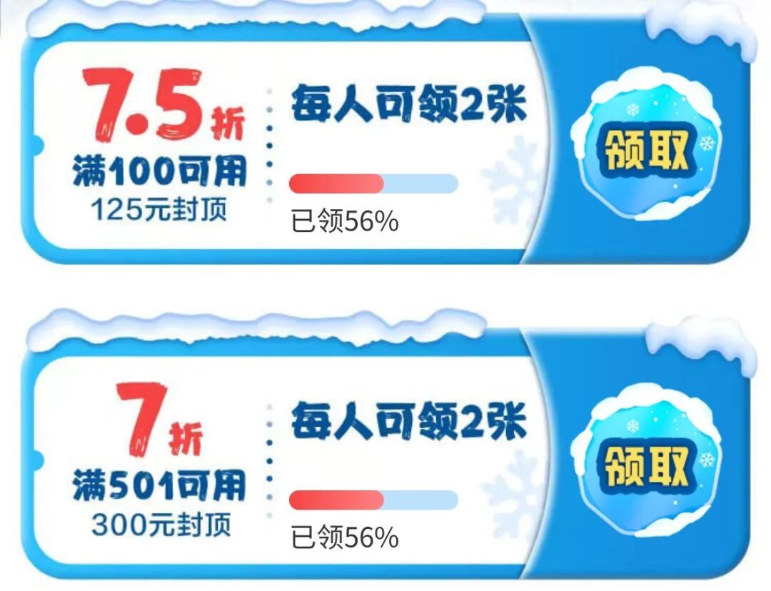 满100元打75折(封顶125元)、满501元打7折(封顶300元),可以买雪票、景区门票、温泉票、景区+酒店、雪票+酒店等冰雪旅游产品。