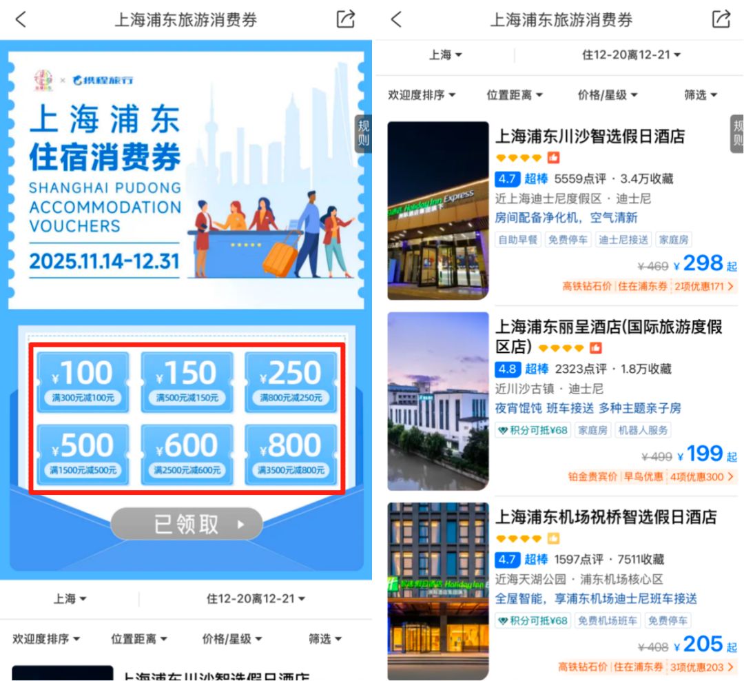 阶梯满减券,最高可减800元。订浦东新区的迪士尼周边、浦东机场酒店都能用。