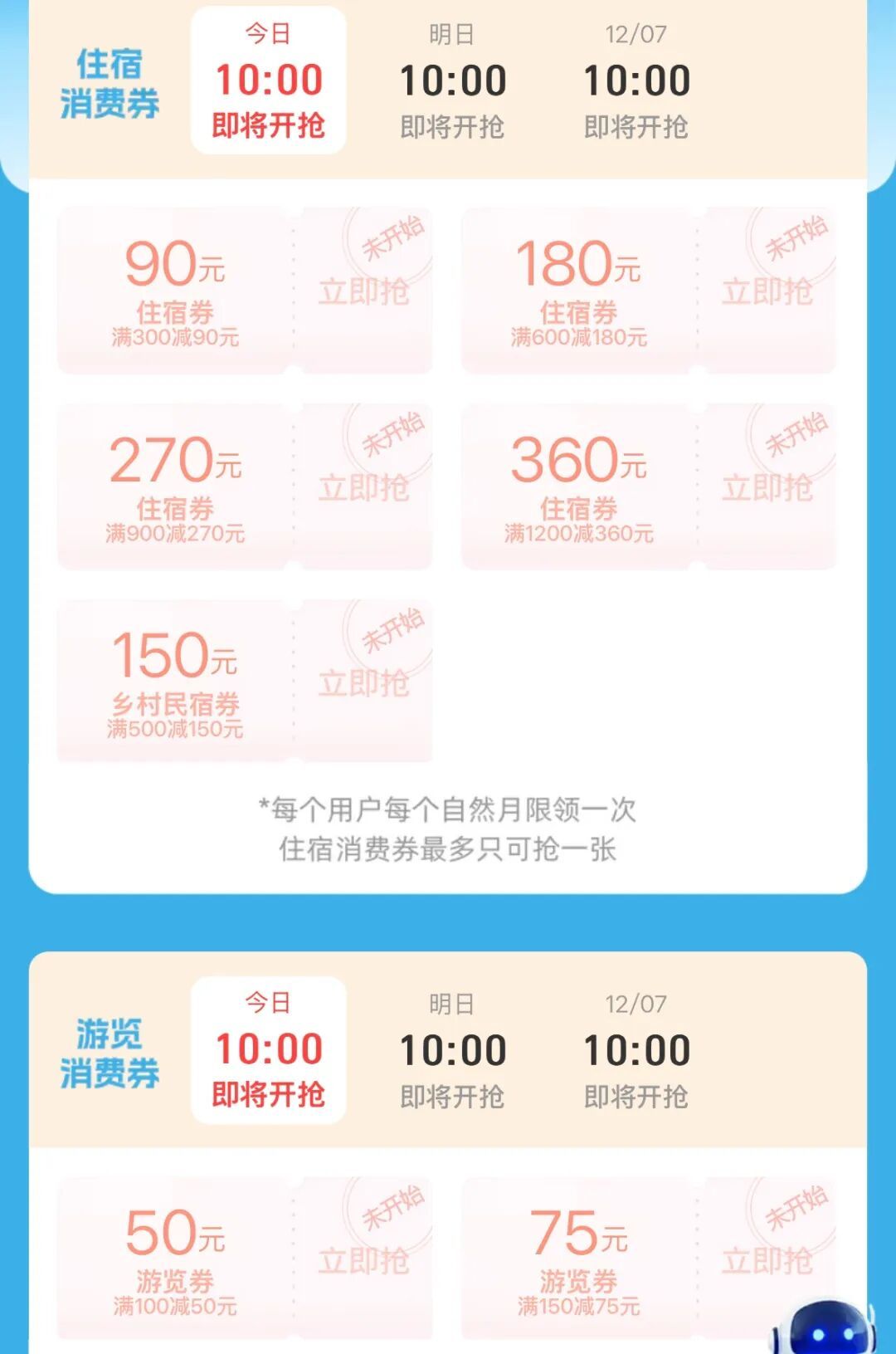 分为住宿券和游览券,每个类型可领1张,单张最高可减360元。