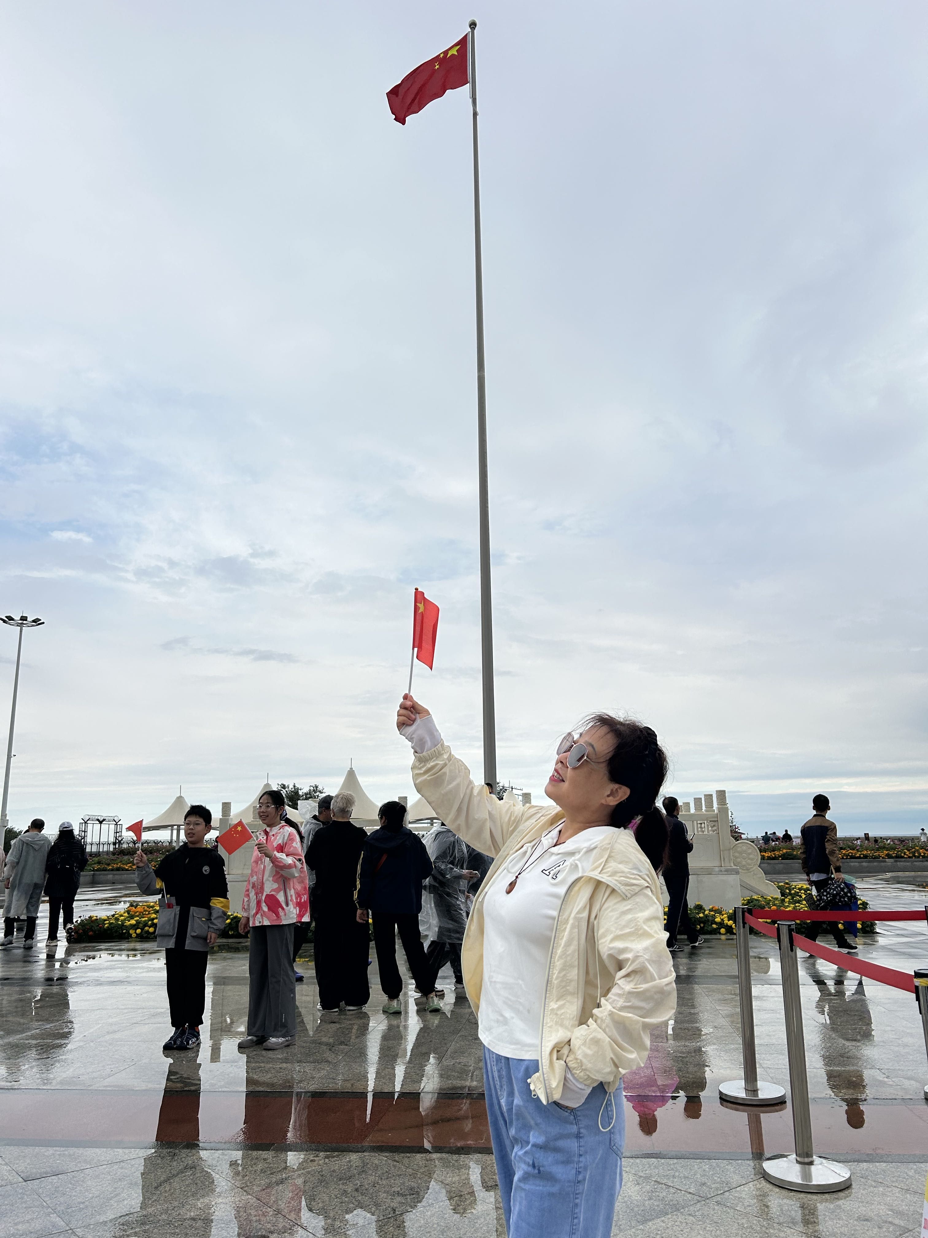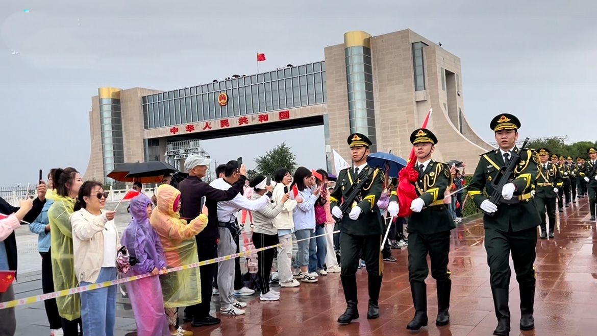 9点10分的升旗仪式是此行的重头戏,只有星期日才有。在旁边的展览馆里,仪仗队士兵在等待着时间到来。游客们邀请一起拍照,两位卫士不加推辞,挺拔站立,游客纷纷站立其间,留下与国旗卫士的美丽合照。将近9点10分,意外的事情发生了,当国旗卫士列队出发时,前一刻还下着的小雨突然停了。人们举着小红旗夹道欢迎,整齐的步伐踏响地面,国歌奏响,镜头里的国旗一点点升高,心里的自豪感跟着往上涌,我也不由得同大家一起唱起了国歌。没有机会在天安门广场近距离观看国旗升旗仪式,却在这北国边城实现了愿望,真的是太开心了。