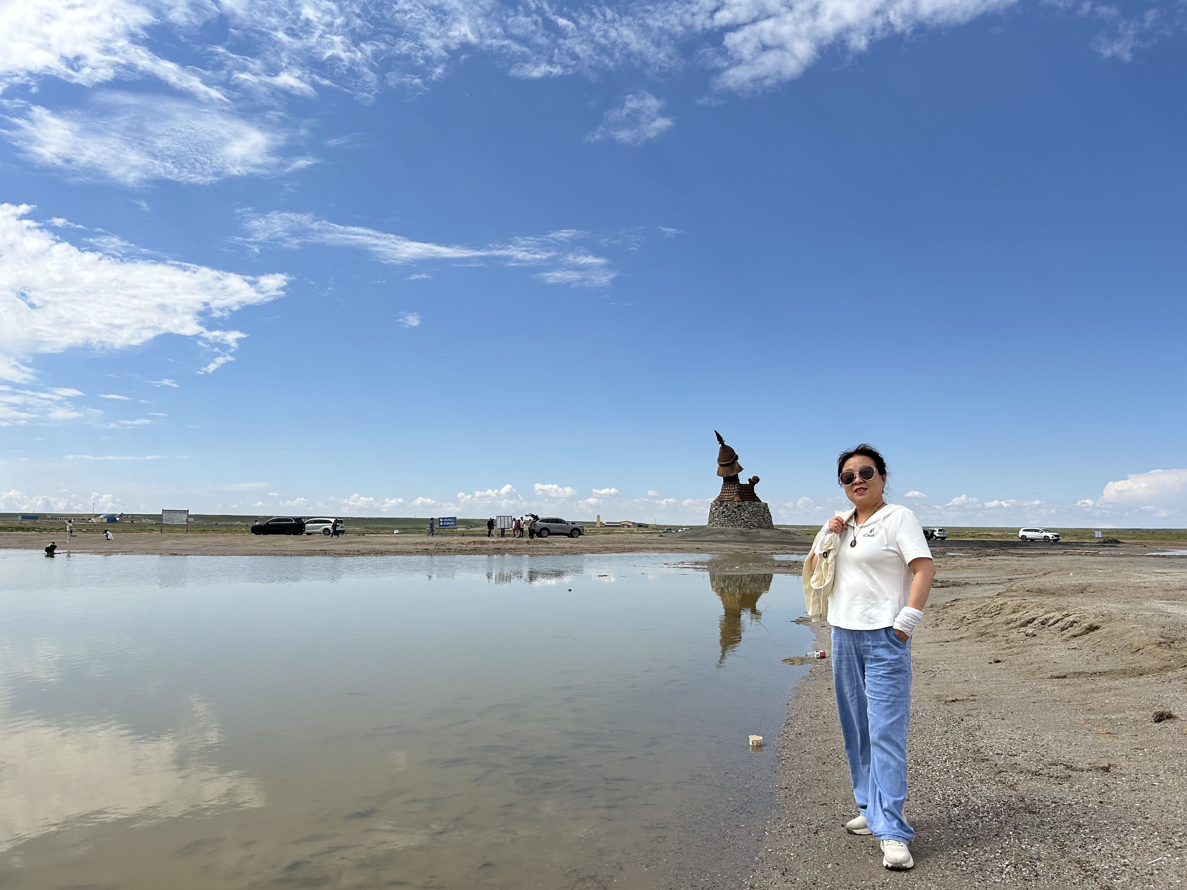 附近不远就是盐池,原以为能看到乳白色的水面,体会掬水成盐的传说。近前却发现水色平平,只能站在岸边拍张照,算是打了个卡。地质公园对面草原里的“如来神掌”更是慕名而至,却只能看到草地上的几条黑色长印,即使站在附近的山坡上也属枉然,应该是通过无人机才能欣赏到吧,无语。