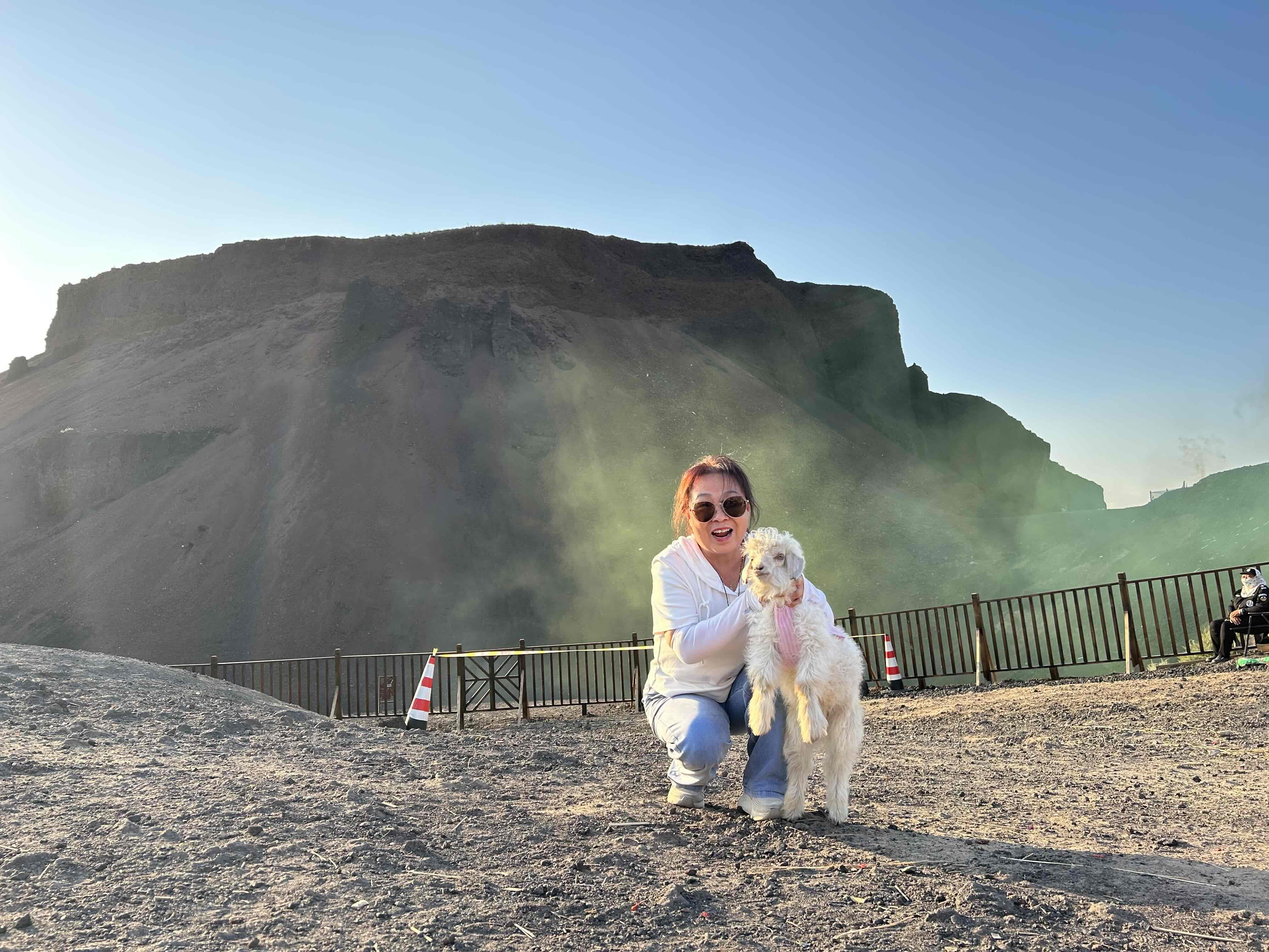 4号火山是一个转运站,北门乘车的旅客需要在此转车到另外一些站点。到了6号火山,也称为南炼丹炉。这座火山更让人惊艳,整座山黑得寸草不生,像被大地的怒火淬炼过,游人没法爬上去。这座火山是最热闹的,人很多,人们租赁上太空服,买上加特林,尤其孩子们更是欢欣,穿着太空服,配上彩色烟雾,拍出的照片就像是在月球表面一样。感觉这才是真正的火山遗迹,以前曾去过的海口火山和大同火山群等,相比来说真是小巫见大巫,不值一提了。我们也租了一套白色太空服,妻子穿上拍照。夕阳西下时,红通通的太阳挨着火山边缘,黑色的山体被染得发亮,美得让人说不出话。黑色火山,金色阳光,白色太空服,色彩斑斓,成了此行最惊艳的画面。