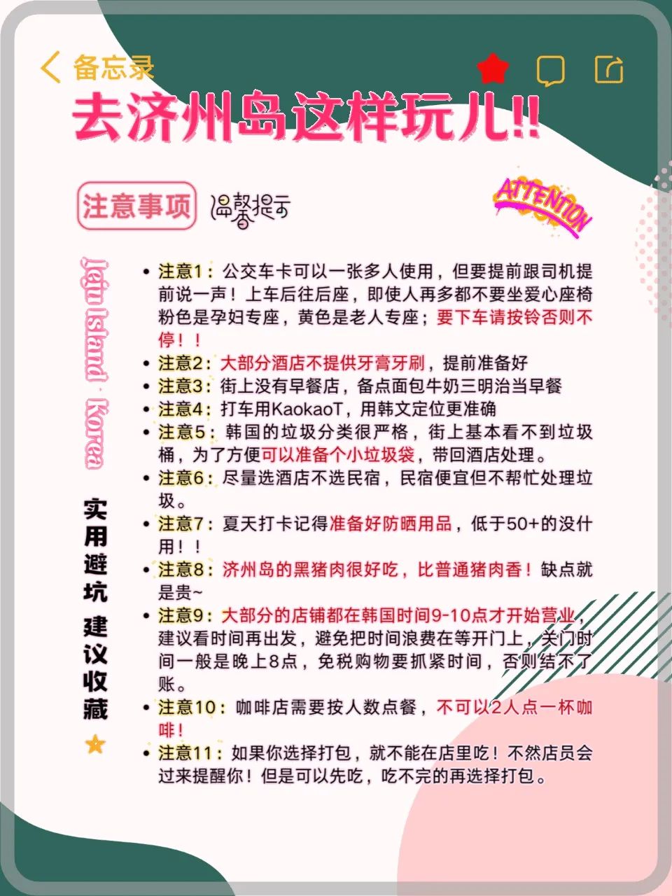 游客需要注意准备好公交卡、酒店的洗漱用品、早午餐、小垃圾袋、防晒霜等物品。另外,济州岛的商铺通常在9-10点开门,游客要避免早到空等。