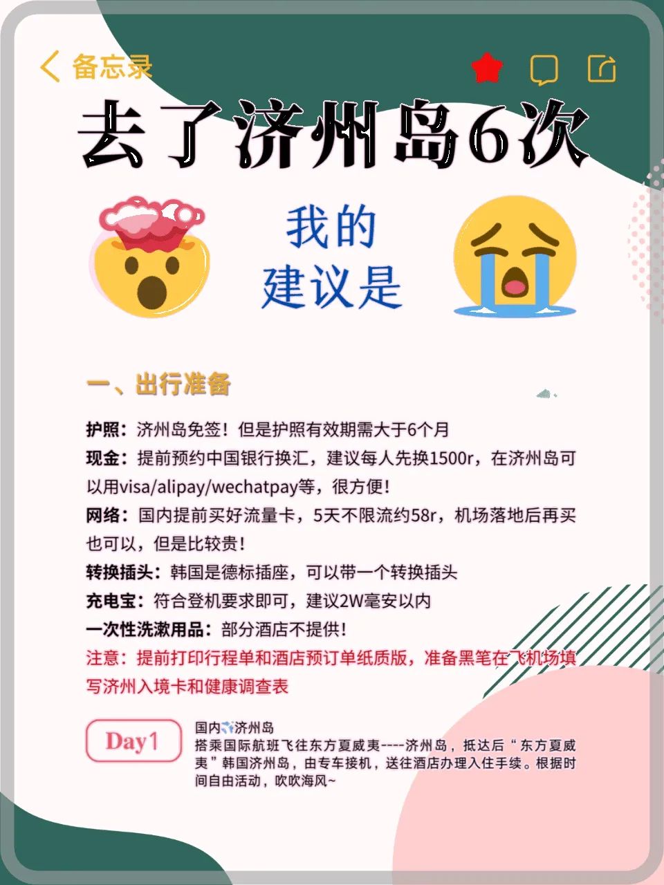 济州岛虽然免签,但护照有效期要大于6个月。建议每人先换1500元人民币韩元,同时还需要准备好网络、转换插头、充电宝等物品。