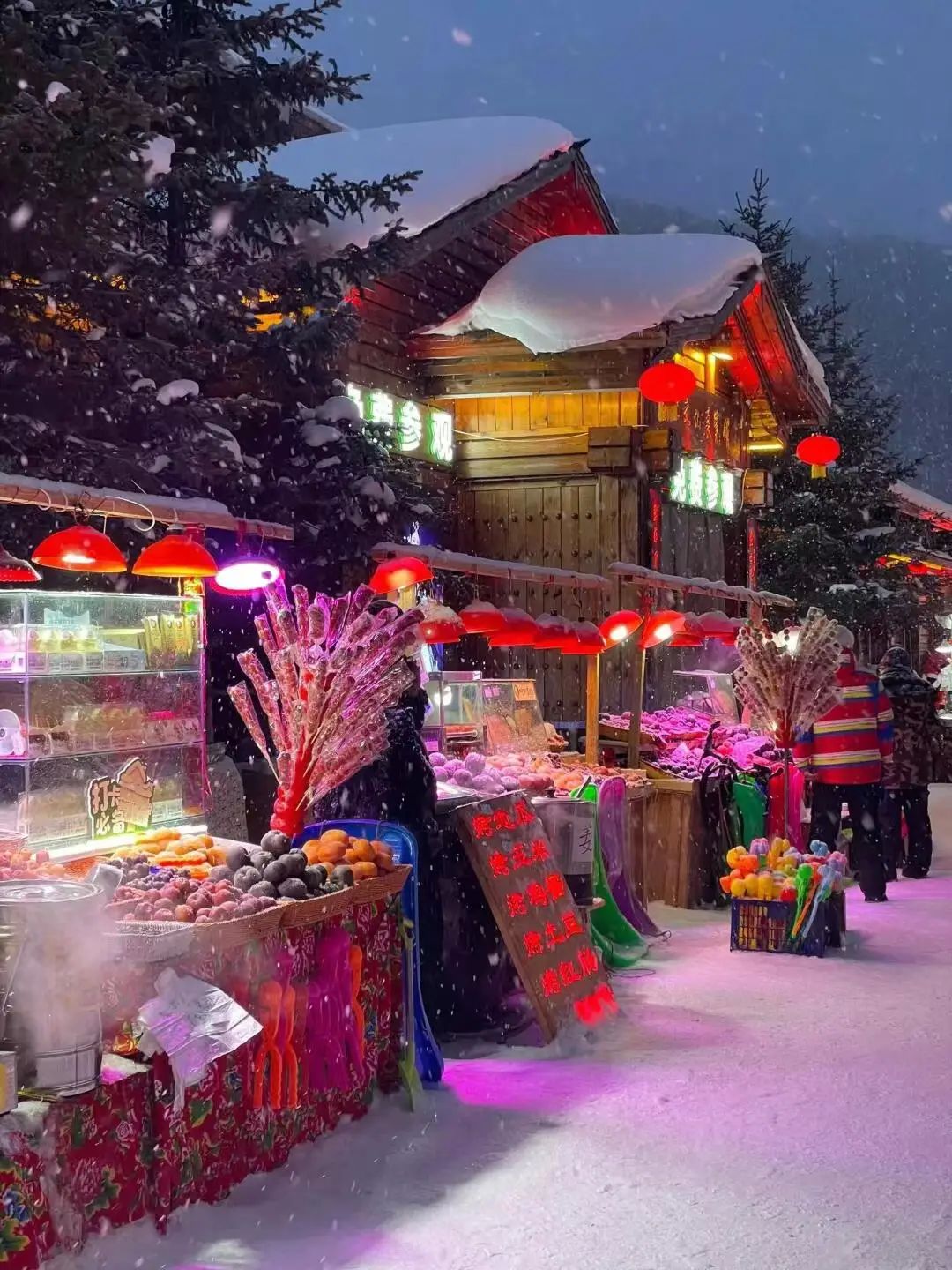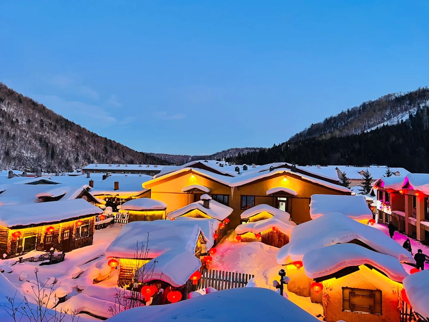 雪乡的主街,也是梦的起点。两旁是可爱的“雪屋子”,屋檐下缀满大红灯笼。建议登上观光栈道,俯瞰整个村落,看袅袅炊烟与灯光交织,将雪景渲染成油画。