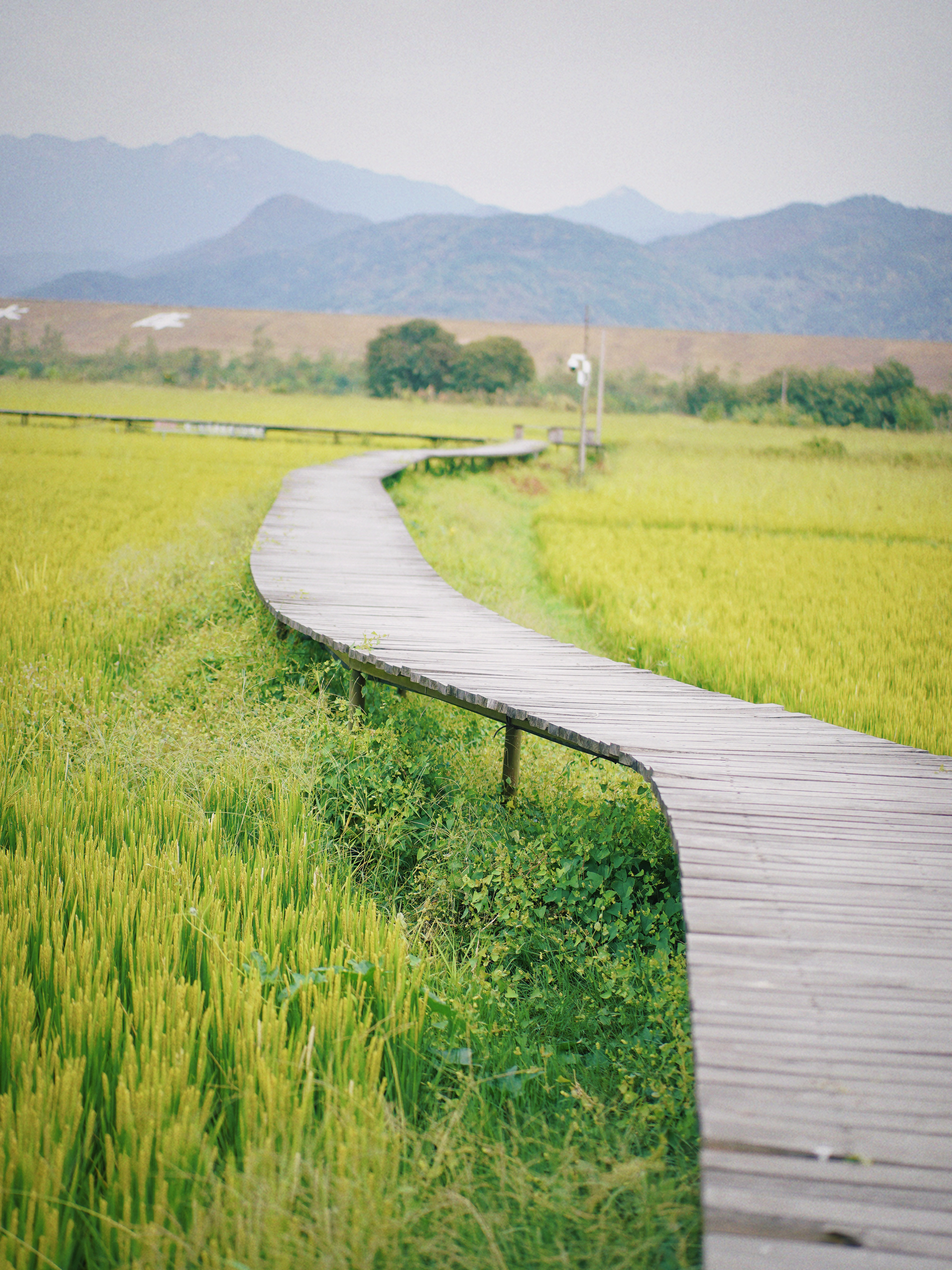 蜿蜒的栈道和田埂把稻田划分为黄绿相间的色块,沿着栈道走进稻田深处,原来,吹过稻花的风是甜的,照射过稻子的阳光特别温柔,稻田间点缀着的亭子,挂着白色帷幔,你可以在那里喝咖啡、玩游戏,在这里,一切都是自便。