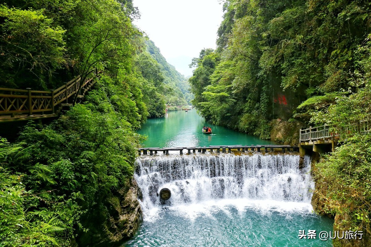 一线天漏出来的光照在水面上,翡翠色的绿色河水,划着小船穿过这片深幽峡谷,18公里长的峡谷,到处都是清澈见底的水,就犹如悬浮在半空一般。谷底的气温比外面低上好几度,是夏季的避暑圣地。