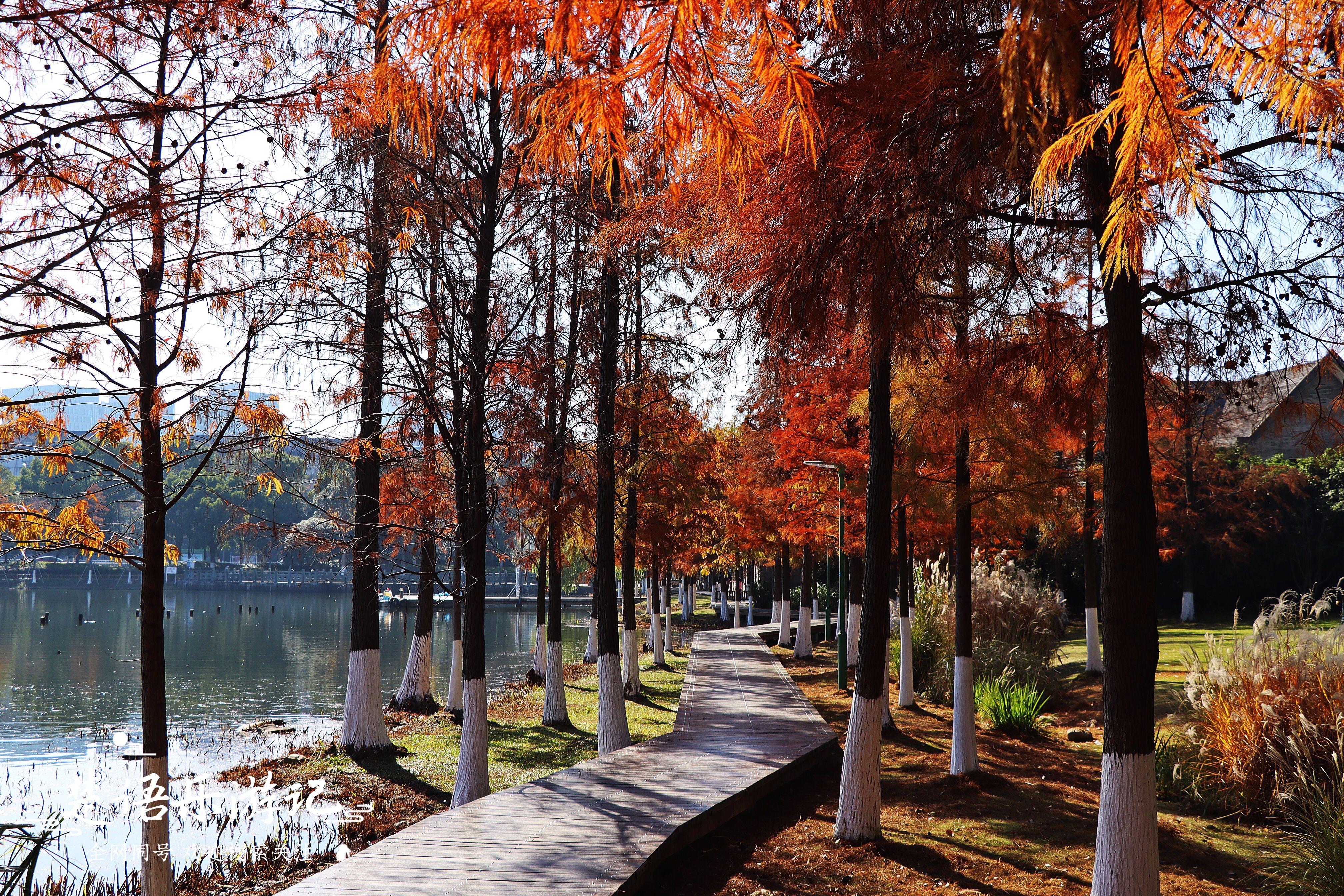 另一处水杉林就是湖西的荷塘处,这里的水杉不多,但是临水而居。林中有一条木栈道,因而成为很多的拍摄点。