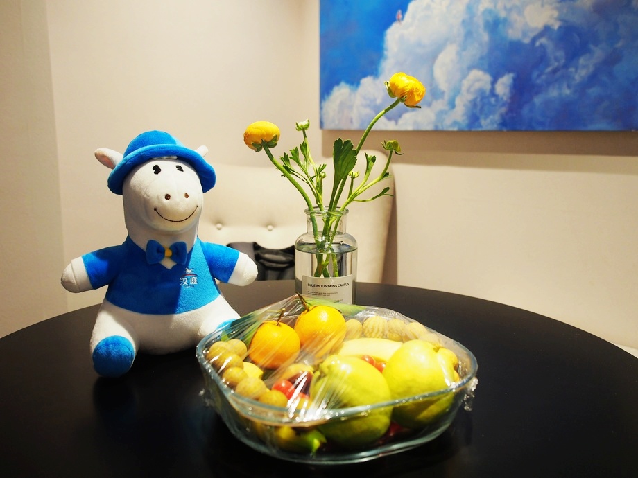 一走进房间,就被小桌上的欢迎水果和吉祥物小汉马给萌到了。