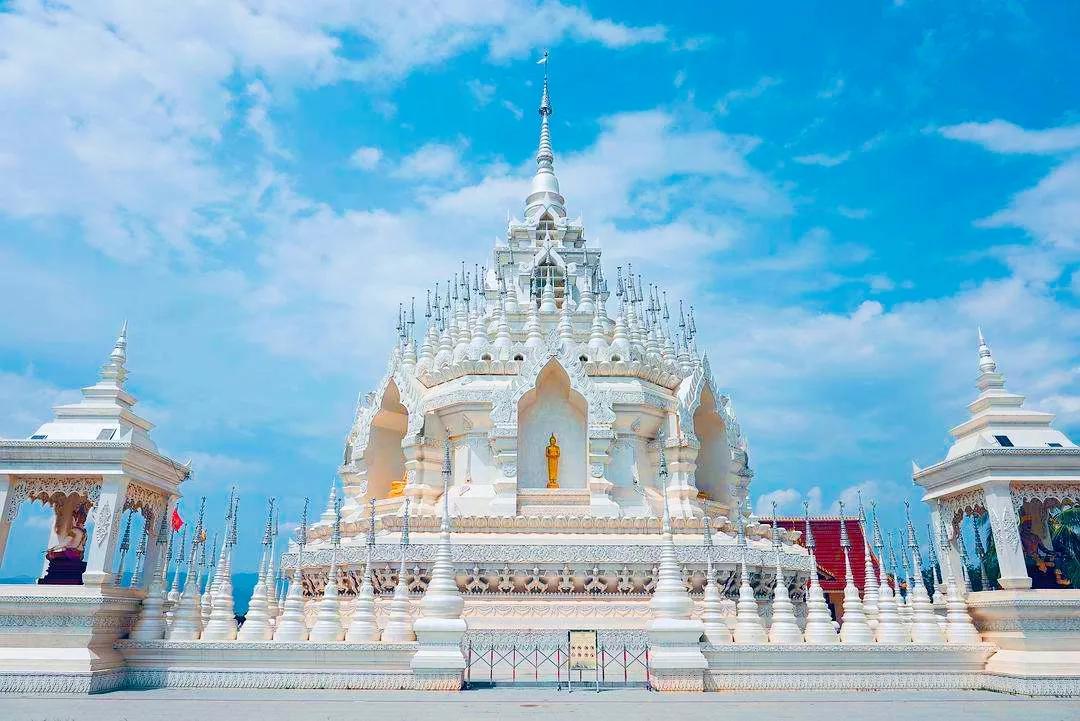 这座白色佛塔是典型的傣式佛塔,和泰国的佛塔造型非常相似,都是那种非常的精美、华丽的类型。塔高8.2米,多个方位都塑造了形态各异的金色佛像。另外在塔的四个周边还各有一个佛龛,里面供奉着护法神。喜欢东南亚建筑的游客,去了西双版纳非常建议来这里看看,真的很精美,有特色。