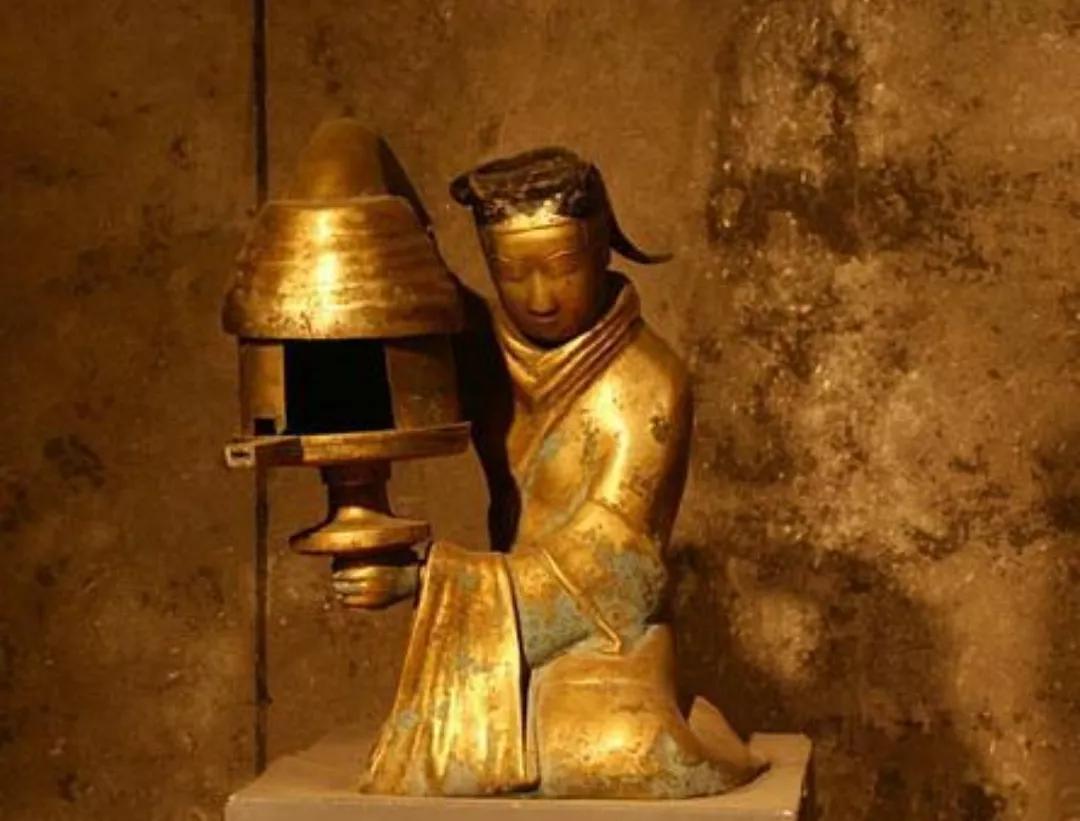 “金缕玉衣”共有完整的两套,全部用玉片制成,玉片间以金丝相连缀,其价值之高,做工之精,世所罕见。其中刘胜的玉衣稍长,共用498块玉片、1100克金丝制成,王后窦绾的玉衣与这件结构相同,只是所用玉片和金丝数量略少而已。“长信宫灯”是一盏高48厘米的镀金宫灯,旁边有一宫女跪坐执灯,灯上刻有铭文。