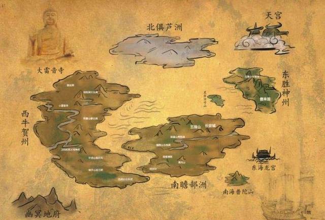 说过了“三皇五帝”,我们再来看“四大部洲”。“四大部洲”是作者借鉴佛经的说法,再加上西游的设定,将西游世界的地理以方位划分的四个板块,分别是东胜神洲、西牛贺洲、南赡部洲和北俱芦洲。坐镇天庭的玉皇大帝代表皇权,总辖四方。其中,东胜神洲是道派众多神仙的聚集地,也是孙悟空的出生地。佛派以如来为首管理着西牛贺洲。南赡部洲是大唐的所在地,而所谓的“东土大唐”就是针对它西边的西牛贺洲而言。